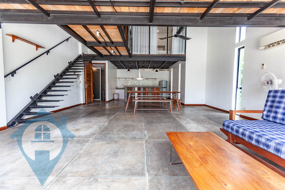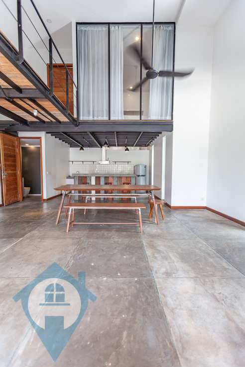 This spacious two bedroom duplex apartment for rent is located in the heart of the popular central district of BKK1 in Phnom Penh. The property is spread over two floors with two bedrooms and one bathrooms. The main living / dining and kitchen area is completed in a modern industrial theme with large windows and high ceilings. The upstairs is accessed via a feature metal staircase and the two bedrooms are separated by a suspended walkway creating a feeling of space and light. This unit is on the 1st and 2nd floor and the entrance is secure / clean and well maintained. This building is within walking distance of supermarkets / coffee shops / restaurants and many local amenities. Please quote property code : PRE001731