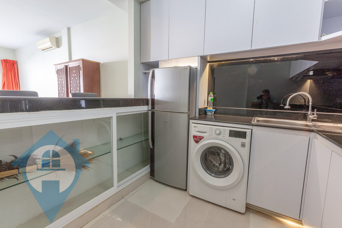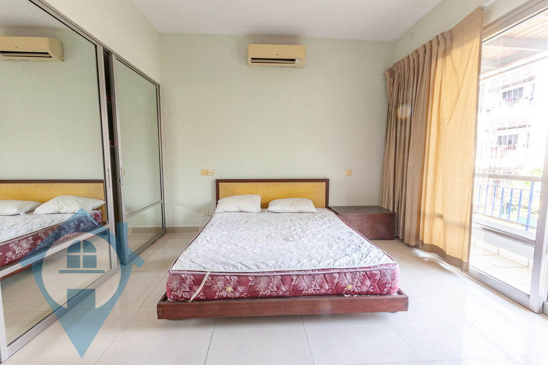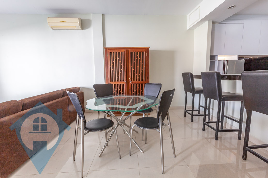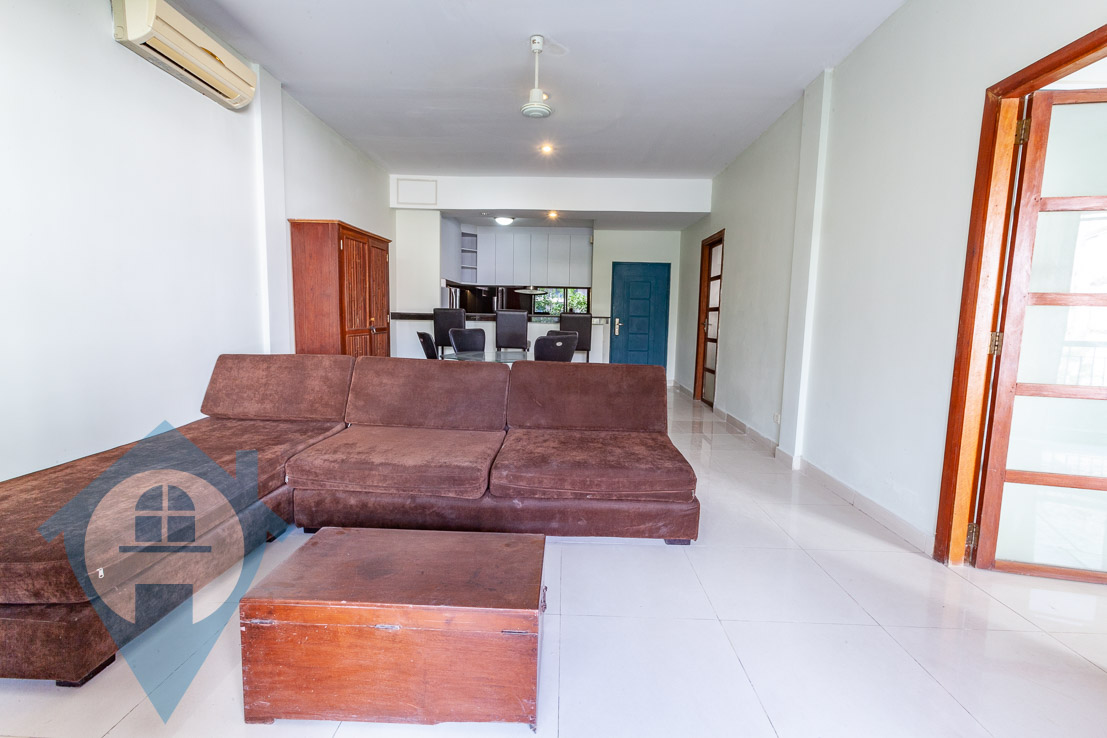 This two bedroom apartment for rent is located on street 118 in the popular riverside district of Daun Penh in Phnom Penh. The property is on the 2nd floor and comes with two bedrooms and two bathrooms. The apartment is fully serviced and has a large private balcony. The entrance is via a communal shared stairwell and there is communal parking for both cars and motos less than half a block away. This apartment is close to the French international school – Lycée Français René Descartes Please quote property code : PRE001664