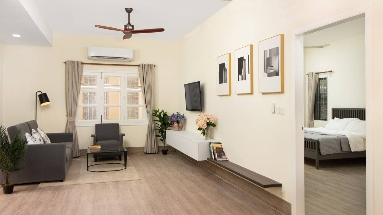 This two bedroom apartment for rent is located in the heart of the popular BKK1 district in central Phnom Penh. The unit comes with two bedrooms and two bathrooms. The apartment comes fully furnished and fully serviced with secure parking for both cars and motos. The apartment is within a renovated older building that still maintains its original charm with spacious communal outdoor seating areas. This building is within easy walking distance of many local amenities and it very popular with expat families. Please quote property code : PRE001628