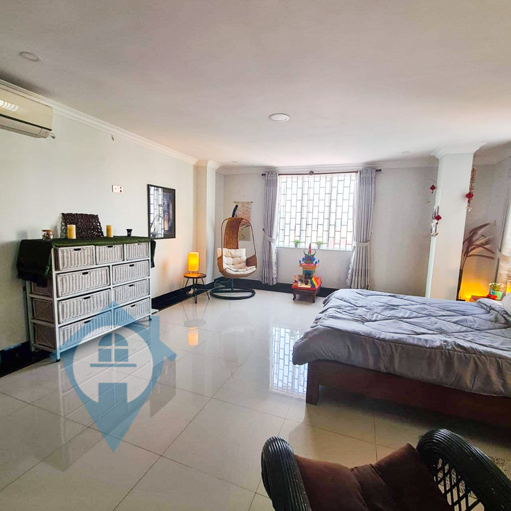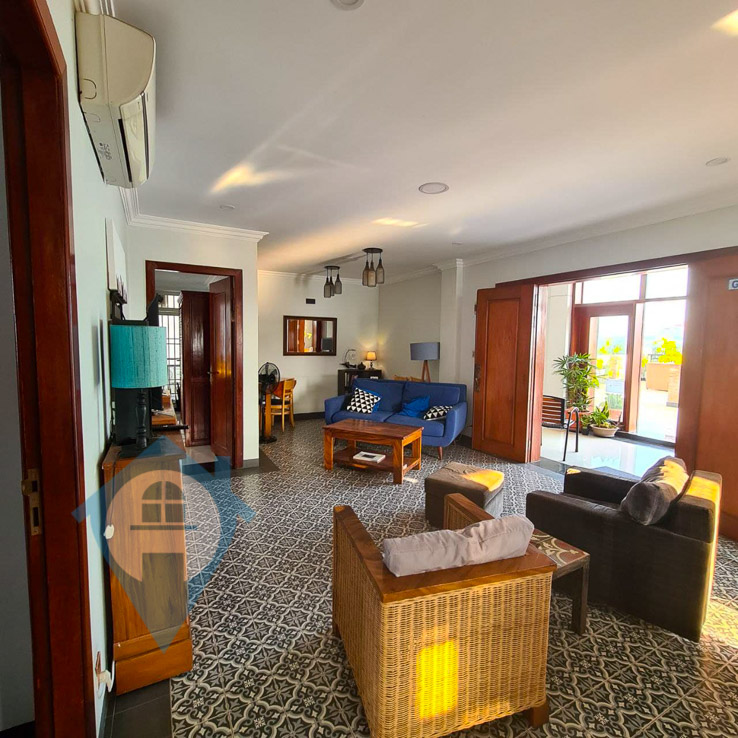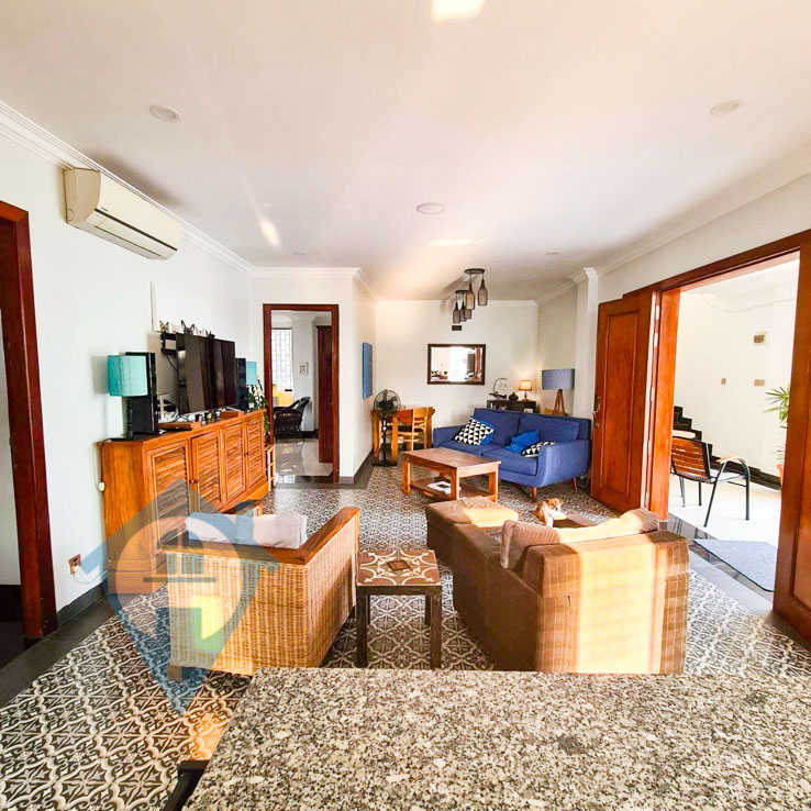 This three bedroom apartment for rent is located within walking distance of the landmark Aeon Mall in the popular Tonle Bassac district of Phnom Penh. This apartment comes fully furnished and with lots of windows is both bright and airy. The property comes with three bedrooms and three bathrooms and has access to a large rooftop terrace. The building has parking for both cars and motos and comes with 24 hour security. Please quote property code : PRE001468