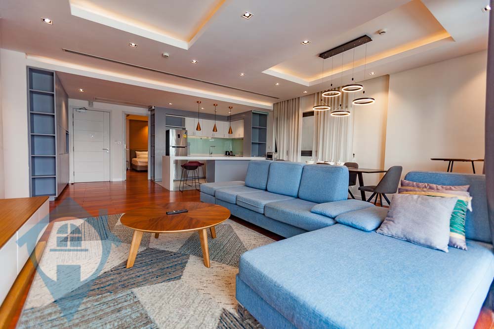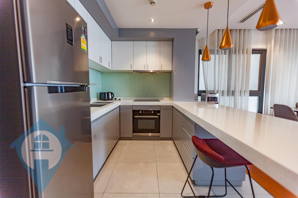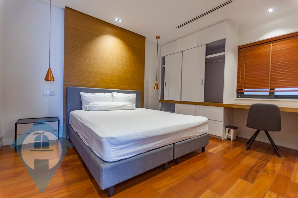This modern three bedroom apartment for rent is located in Boeung Trabek just south of BKK1 | Phnom Penh. The apartment is bright and airy and comes with three bedrooms and four bathrooms and a storage room The building benefits from a rooftop swimming pool and well equipped gym. This building is fully serviced. Please quote property code : PRE001902