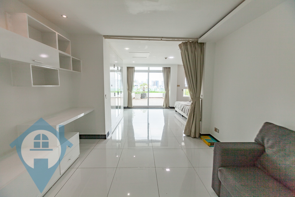 This three bedroom duplex penthouse is located in the popular central district of BKK3 in the heart of Phnom Penh. The apartment comes with three bedroom and three bathrooms plus a study area with can be used as a fourth bedroom. There is a spacious open plan living / dining / kitchen area with lots of natural light and finished in a modern style. There is a large private roof terrace plus an additional spacious balcony. The building comes with a backup generator, parking for cars and motos, steam & sauna, gym, and rooftop swimming pool. Please quote property code : PRE002104