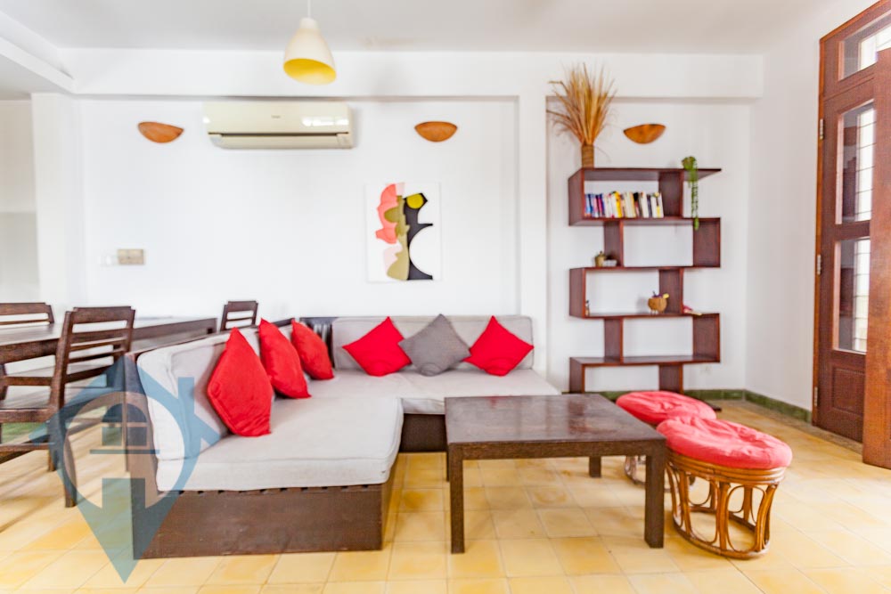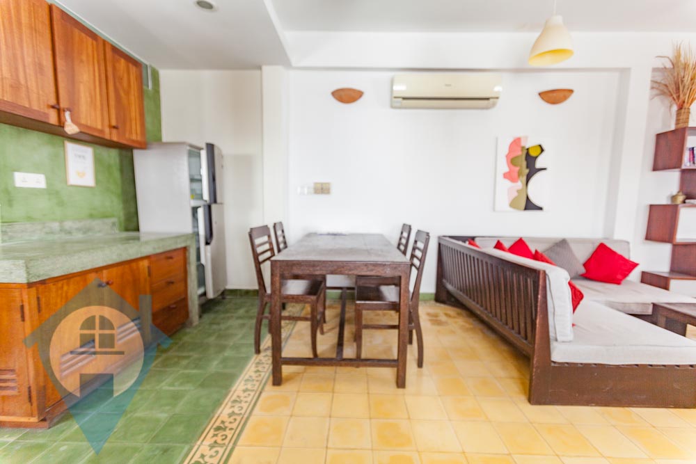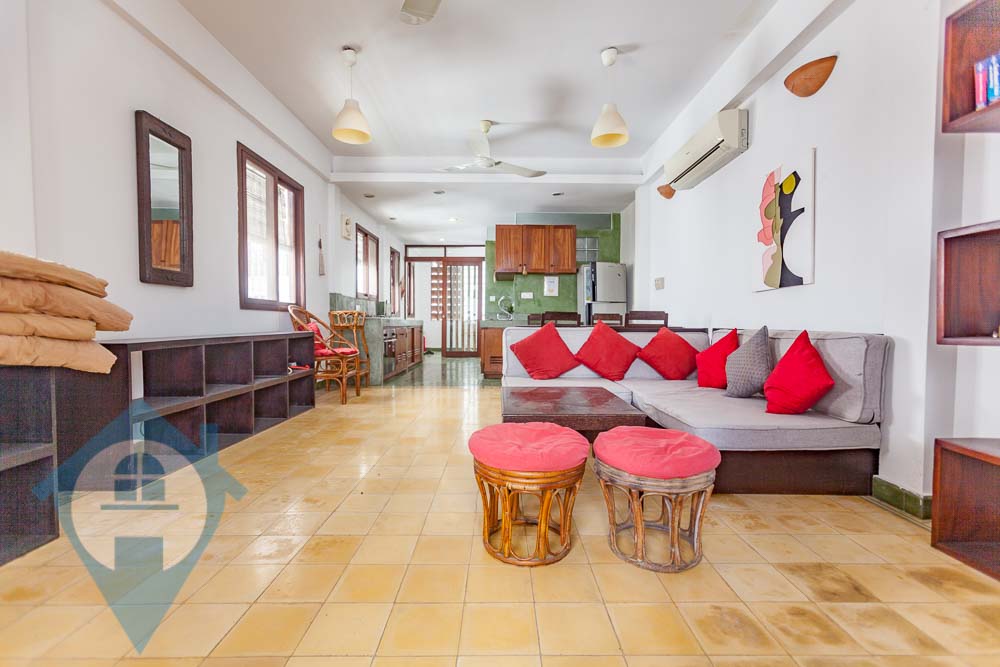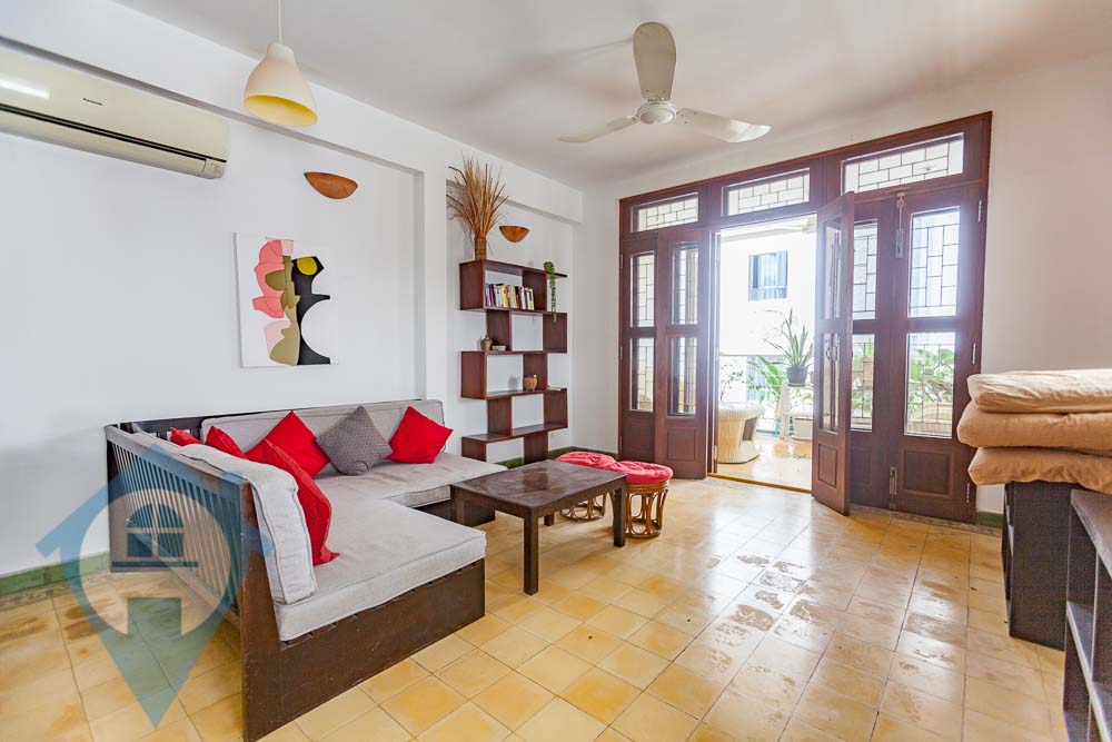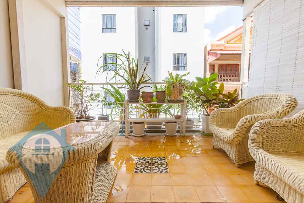 This renovated three bedroom duplex for rent is located close to the landmark Royal Palace in Daun Penh central Phnom Penh. The apartment comes fully furnished with a large private terrace and a small balcony. The property comes with three bedrooms and two bathrooms and is spread over the 2nd and 3rd floors and has a clean and secure entrance with parking for motos. Please quote property code : PRE001882