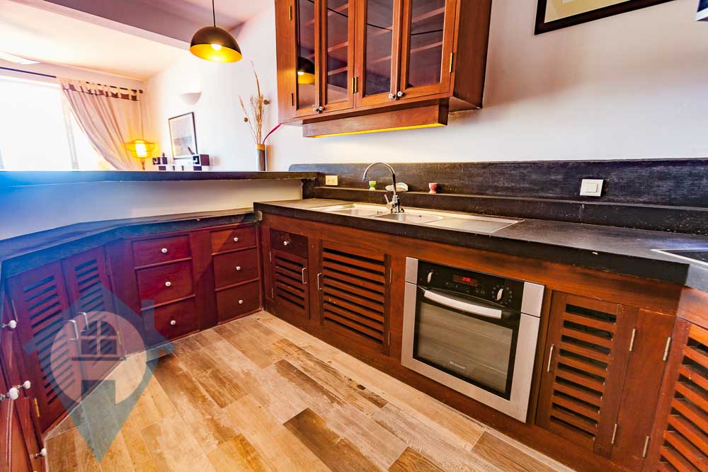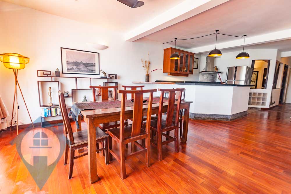 Available for rent, this colonial-style apartment sits on Riverside, Daun Penh, close to the night market. Located on the 5th floor of a secure, historic French colonial building, it boasts a double-width (8m) space with a private terrace overlooking the Tonle Sap. The apartment features Art Deco solid wood furnishings (removable), hardwood floors, a modern kitchen with appliances, a furnished living room with large windows, and an updated bathroom with a washer. Ideal for up to four people, it includes amenities such as water, cable TV, and internet (Ezecom) for $220 per month, also covering security with intercom, CCTV, 24-hour staff, A/C maintenance, elevator access (unique in Riverside), and common area cleaning. Additional benefits include 24-hour security, A/C, a balcony, a BBQ area, CCTV, ceiling fans, high ceilings, ample natural light, proximity to Central Market, the French and USA Embassies, schools, parking, and a tourism-friendly location, fully furnished with a washing machine and WiFi. Please quote property code : PRE001993
