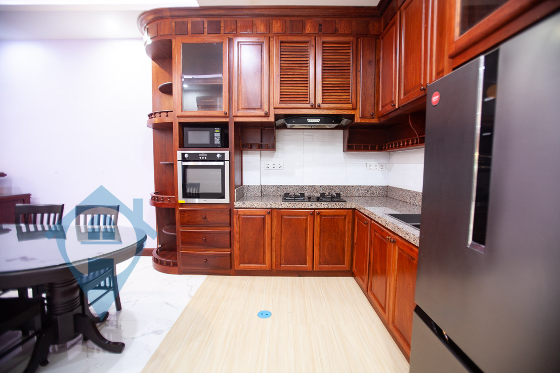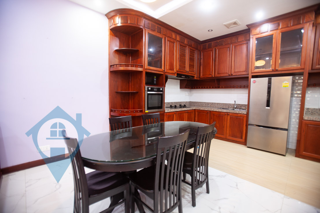 This three bedroom villa for rent is located beside the landmark Aeon mall in Tonle Bassac in central Phnom Penh. The property comes with three large bedrooms and four bathrooms plus a maids room. The villa comes with a fitted kitchen leading into an open plan living / dining area. The property has a spacious private courtyard with secure parking for several cars. This gated community benefits from a swimming pool, gym, spa, supermarket, 24 security and is popular with expats. Please quote property code : PRE001612