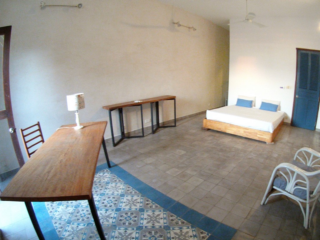 Wide living room and terrace overlooking the city, sunny with cool temperatures. On 3rd floor, 2 large bedrooms king size bed, dressing and 2 private bathrooms. On 4th floor, living/dining area with polished cemented floor, large windows, large bedroom, 2 lovely private bathroos and open kitchen view on the terrace. Nice mezzanine, standard high 2.30m and a king size bed. Quiet, located near corner of street 110 and 19. (Access to the apartment is a common stair case in Cambodian neighborhood) Please mention N° 60 Contact by email : English or French Contact by phone : English or French or khmer