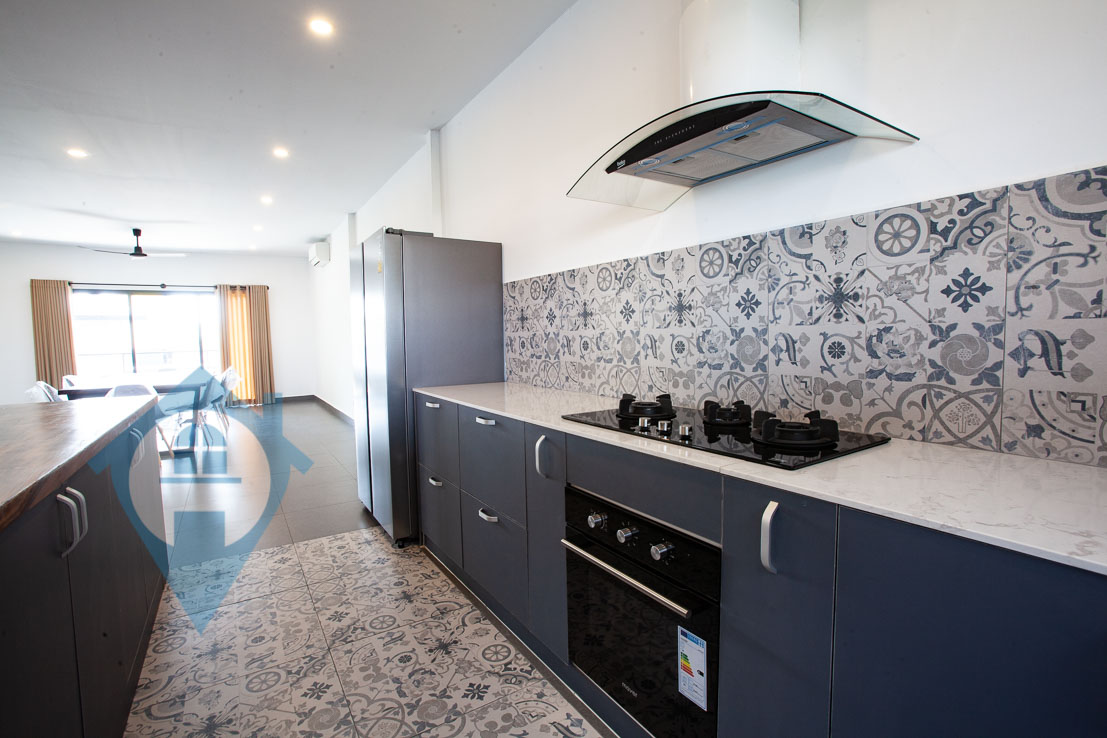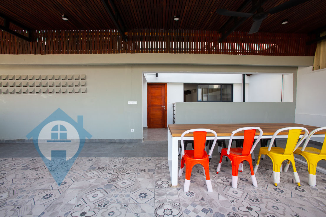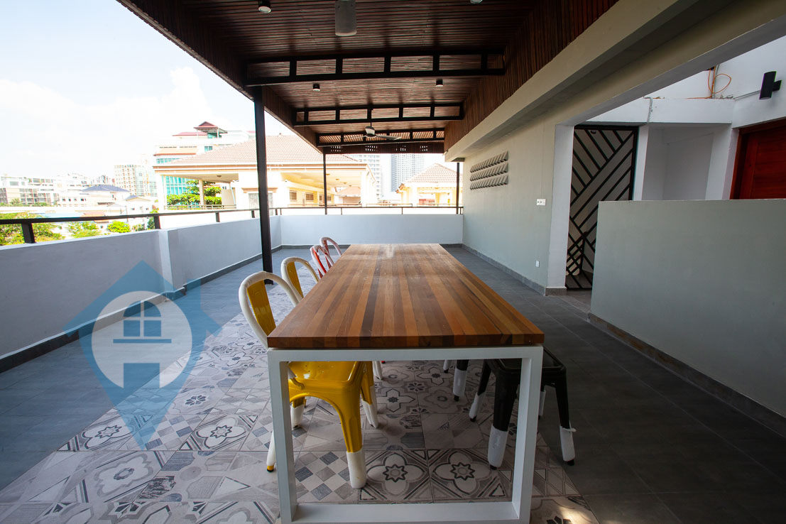 This four bedroom bedroom penthouse apartment for rent is located in the western district of Toul Kork in Phnom Penh. The property comes with four bedrooms and five bathrooms. There is a large private balcony and private rooftop terrace. The apartment is spread over two floors and comes fully furnished. Please quote property code : PRE001407