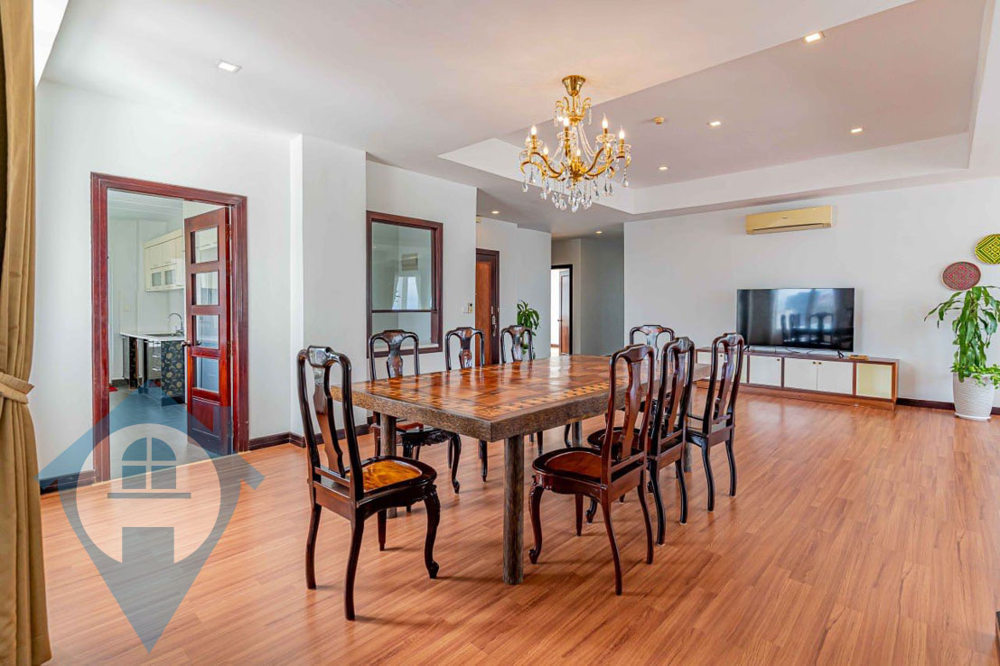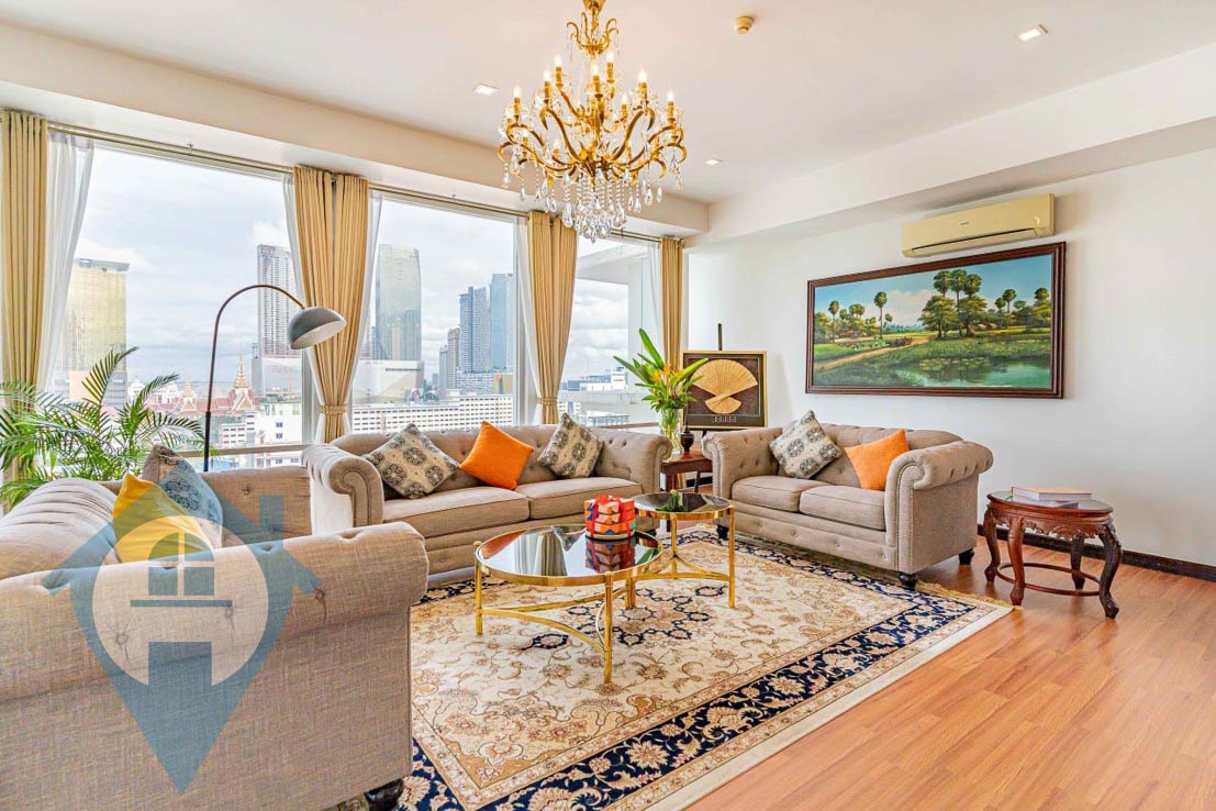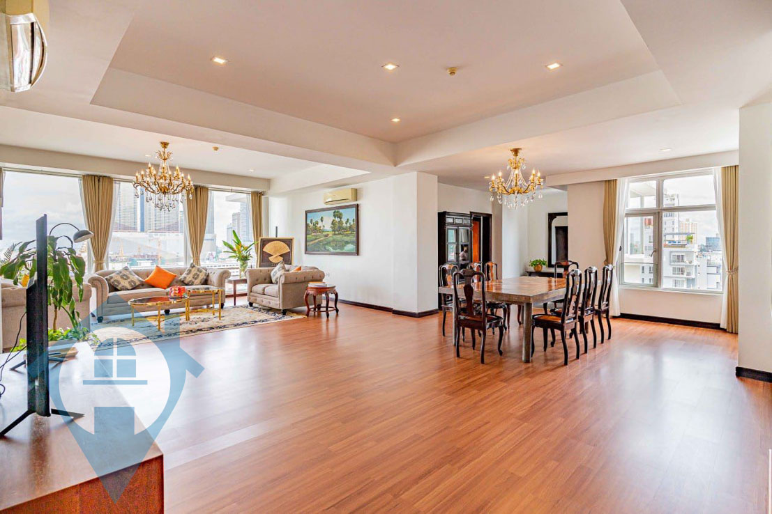 This opulent, fully furnished 4-bedroom penthouse, nestled on the 10th floor, spans a generous 350 sqm, offering breathtaking cityscape views towards the Independence Monument from its expansive terrace. The vast living space, adorned with hardwood flooring, houses wall-to-wall glass windows, basking the penthouse in an abundance of natural light. The property prides itself on its capacious, top-of-the-line kitchen, perfect for any culinary enthusiast. The building's prime amenities enrich the stay, providing bi-weekly cleaning, twice-a-month linen changes, complimentary water, and first-availability parking. Residents also avail of luxurious facilities such as a swimming pool, gym, sauna, and steam rooms. Strategically positioned in Tonle Bassac, Phnom Penh, the location allows convenient access to shopping, dining, and major thoroughfares, positioning it as an ideal urban retreat. Please quote property code : PRE001901