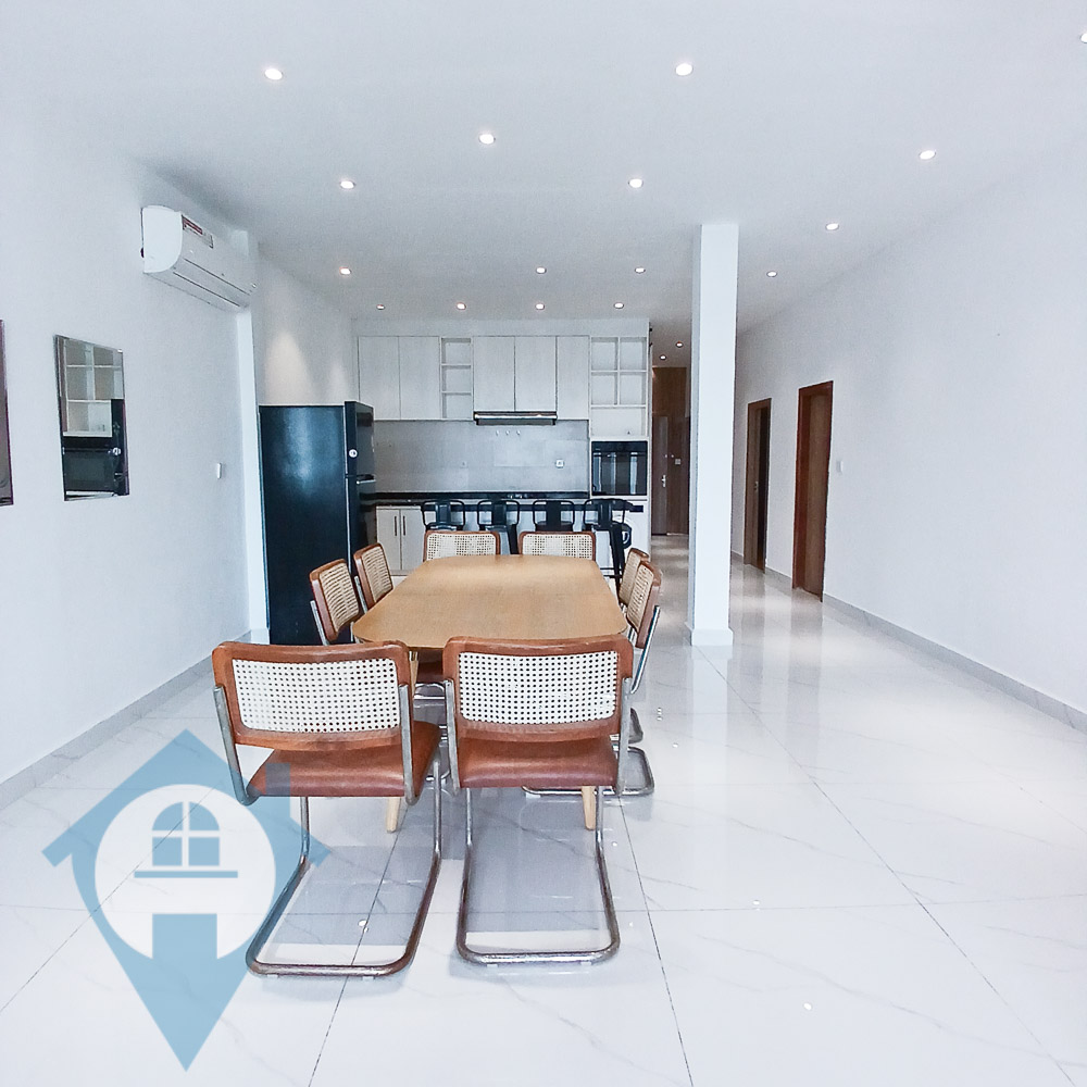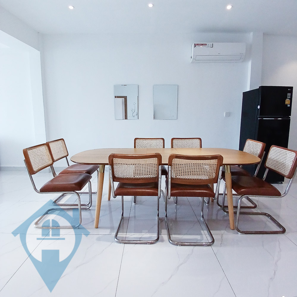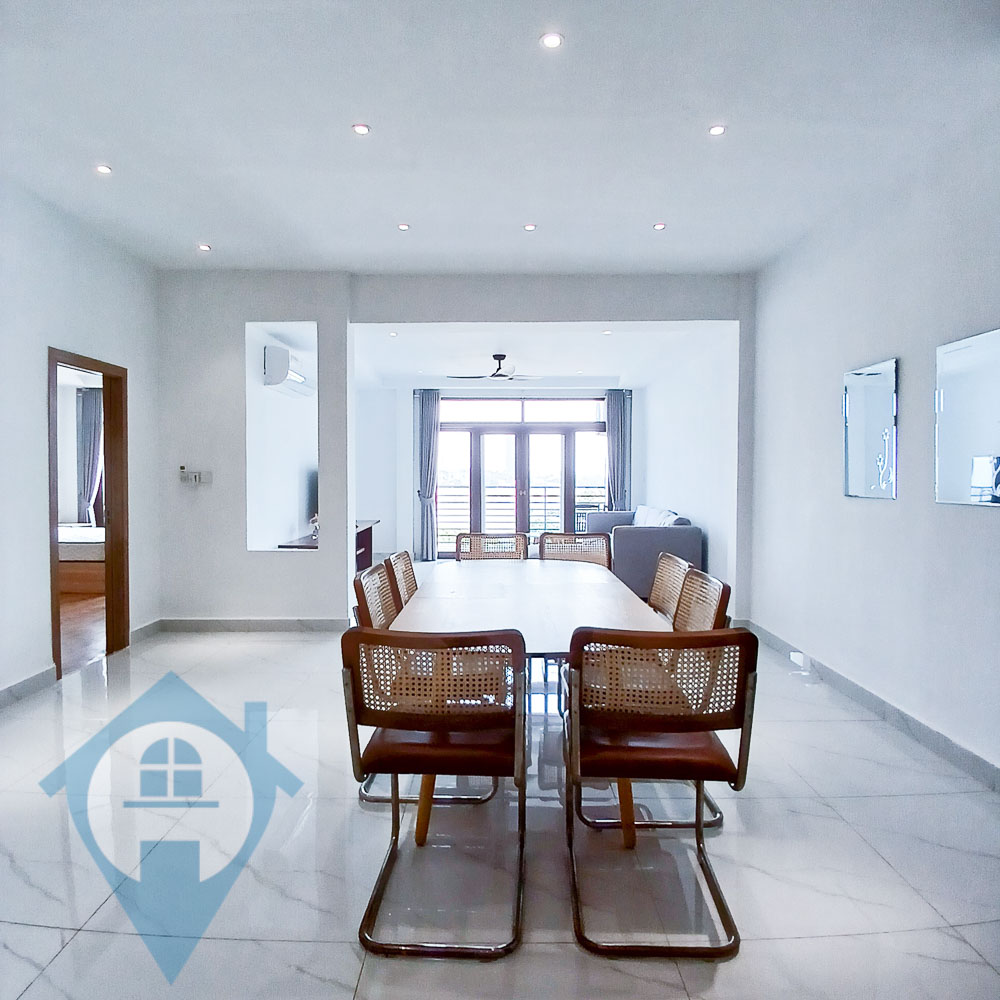 Discover spacious living in this 180 sqm serviced apartment, designed for you to enjoy every moment in Phnom Penh. With four bedrooms, this fully furnished rental is perfect for a family or a group of young professionals. The open main hall features a galley kitchen, an eight-seater dining table, and a comfortable lounge with an L-shaped sofa and a flatscreen TV. Each bedroom is furnished with a large bed and a dresser, providing a comfortable personal space. The bathrooms are equipped with hot and cold water showers. Step out onto the private balcony to unwind with scenic city views. For your convenience, the rental rate includes WiFi, cable TV, and weekly housekeeping services. Additional Details: Nearby Locations: 3 minutes from Preah Ang Duong Hospital & Vattanac Capital; 5 minutes from the University of Puthisastra & the Royal Palace; 10 minutes from Aeon Mall. Cleaning: Provided once a week. Utilities: Water and WiFi are included. Electricity is charged at $0.25/kWh. Parking: Car parking is available for $60 per month. Pets: Pets may be considered upon negotiation. Please quote property code : PRE002193 For a viewing contact Bobby on WhatsApp / Telegram on +85577424840