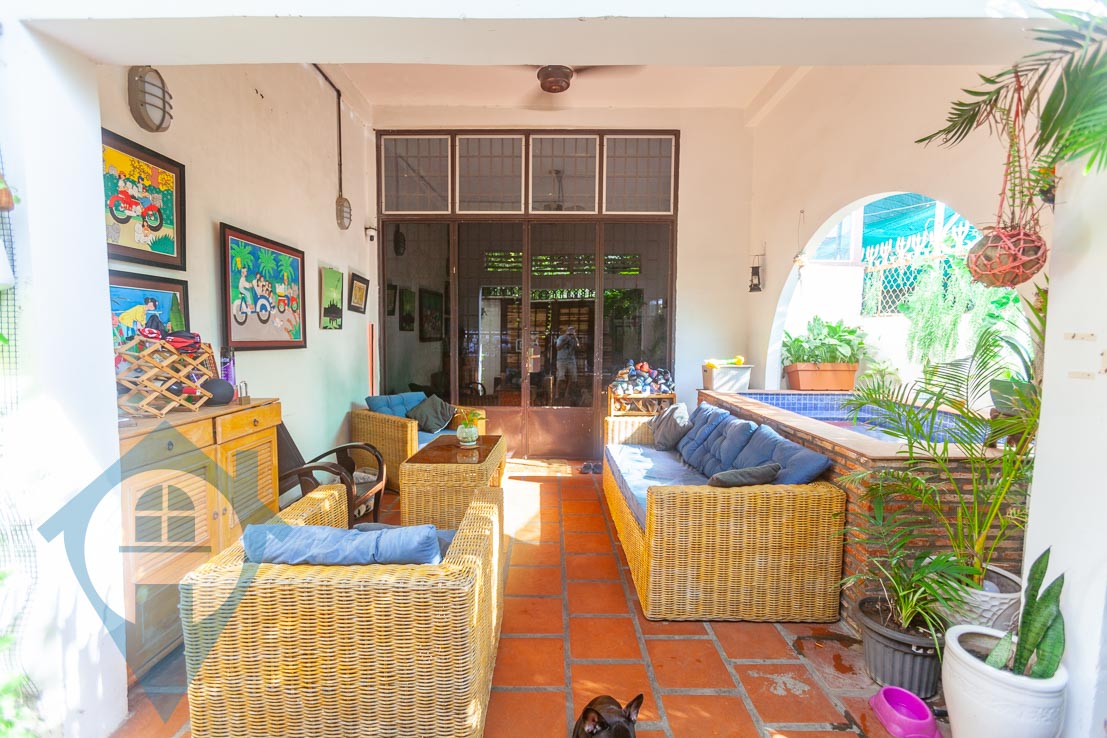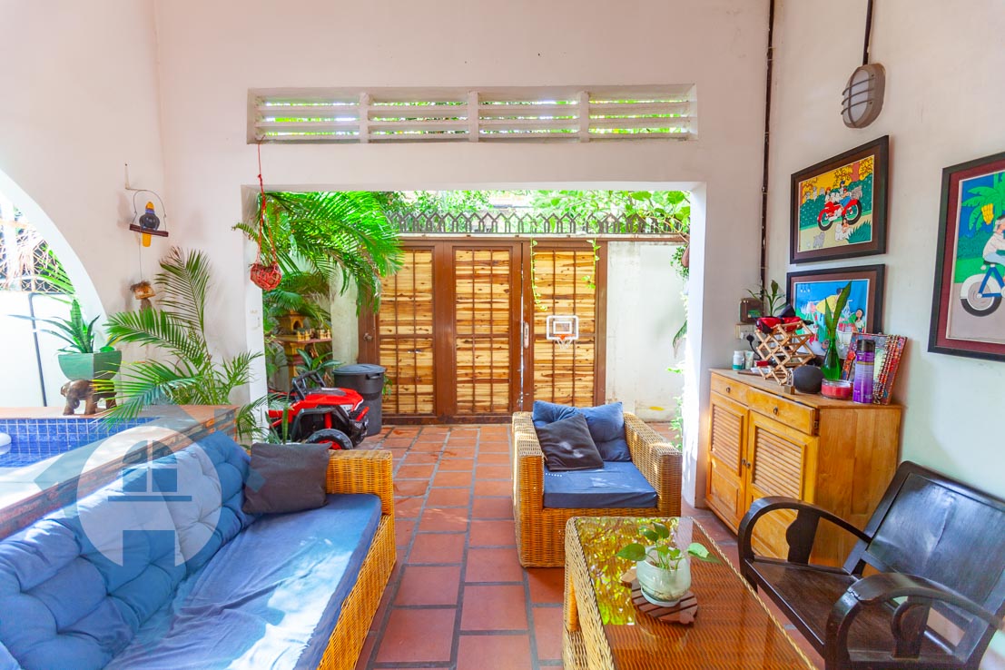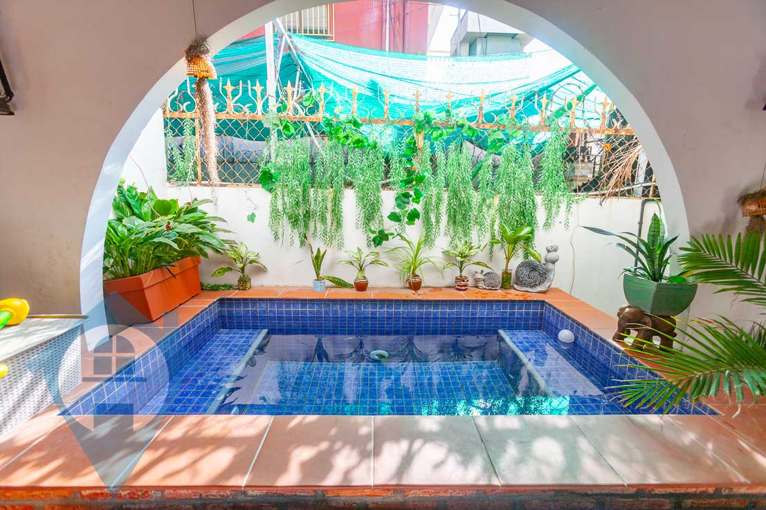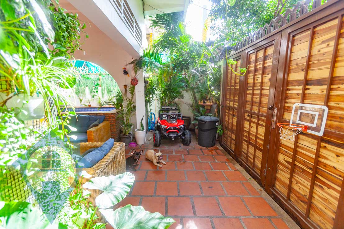 This four bedroom townhouse for rent is located in the central district of Boeung Trabek in Phnom Penh. The house is spread over three floors with two living rooms on the ground floor and first floor and an enclosed rooftop. There are four bedrooms and three bathrooms plus a spare room on the third floor which can be storage of an extra bedroom. The outside courtyard comes with a seating area and plunge pool. There is off street parking for motos or a car. Please quote property code : PRE001851