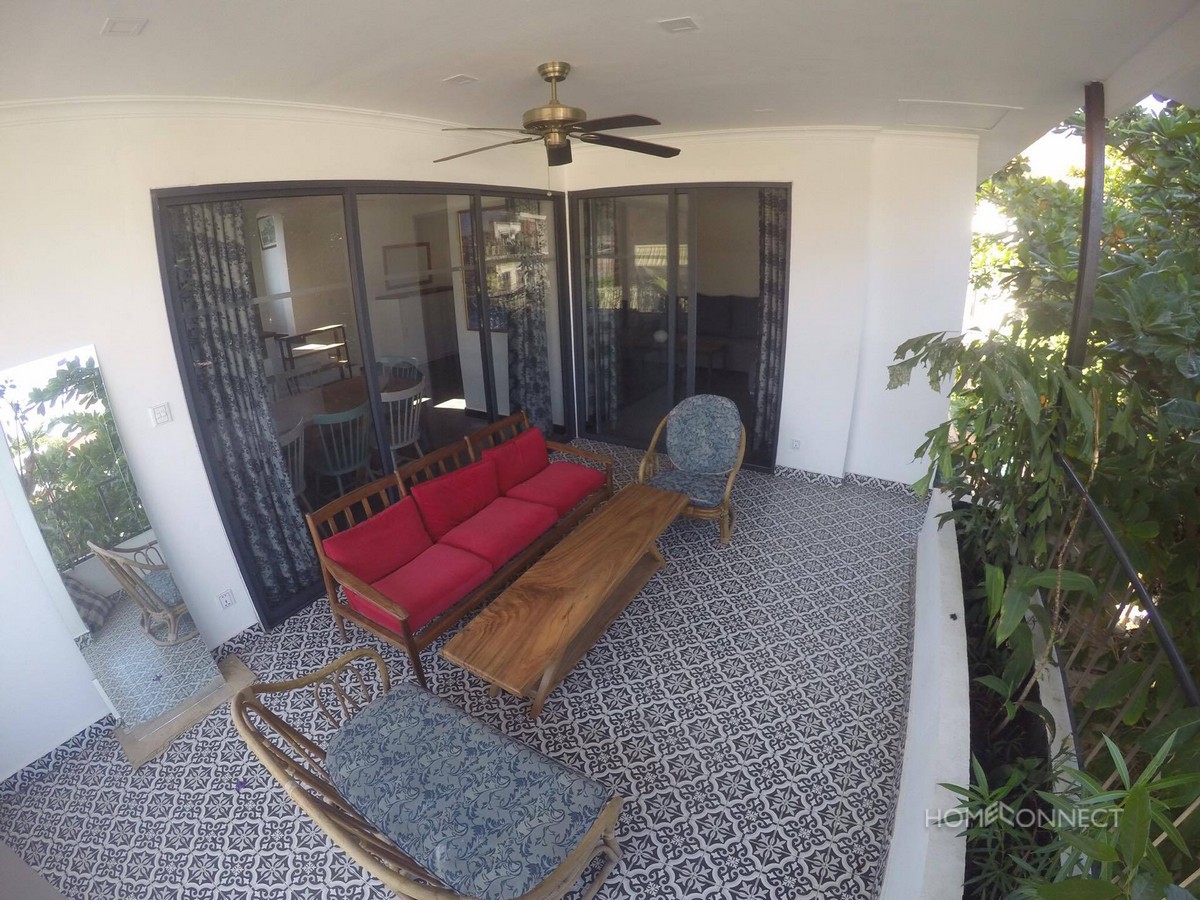 This three bedroom apartment is located beside the famous Royal Palace in the heart of Phnom Penh and offers an alternative to the serviced apartment. The property has been renovated to a high standard with modern western style bathrooms and a fully fitted kitchen. There are several balcony’s and terraces allowing for outdoor living and with lots of windows throughout the property it has a bright and airy feel. Property Code : PRE000579