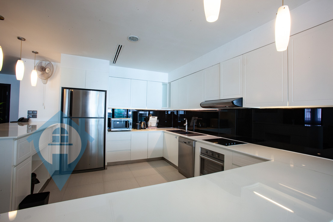 This beautiful four bedroom penthouse for rent in located on a quiet cul de sac in the popular Tonle Bassac district in Phnom Penh. The apartment is bright and airy with four bedrooms and three bathrooms. The large living and dining area leads onto a spacious private terrace. The building benefits from a well equipped gym and spa plus a large rooftop area complete with a stunning swimming pool. There is 24 hour security and secure parking for both motos and cars. Please quote property code : PRE001337