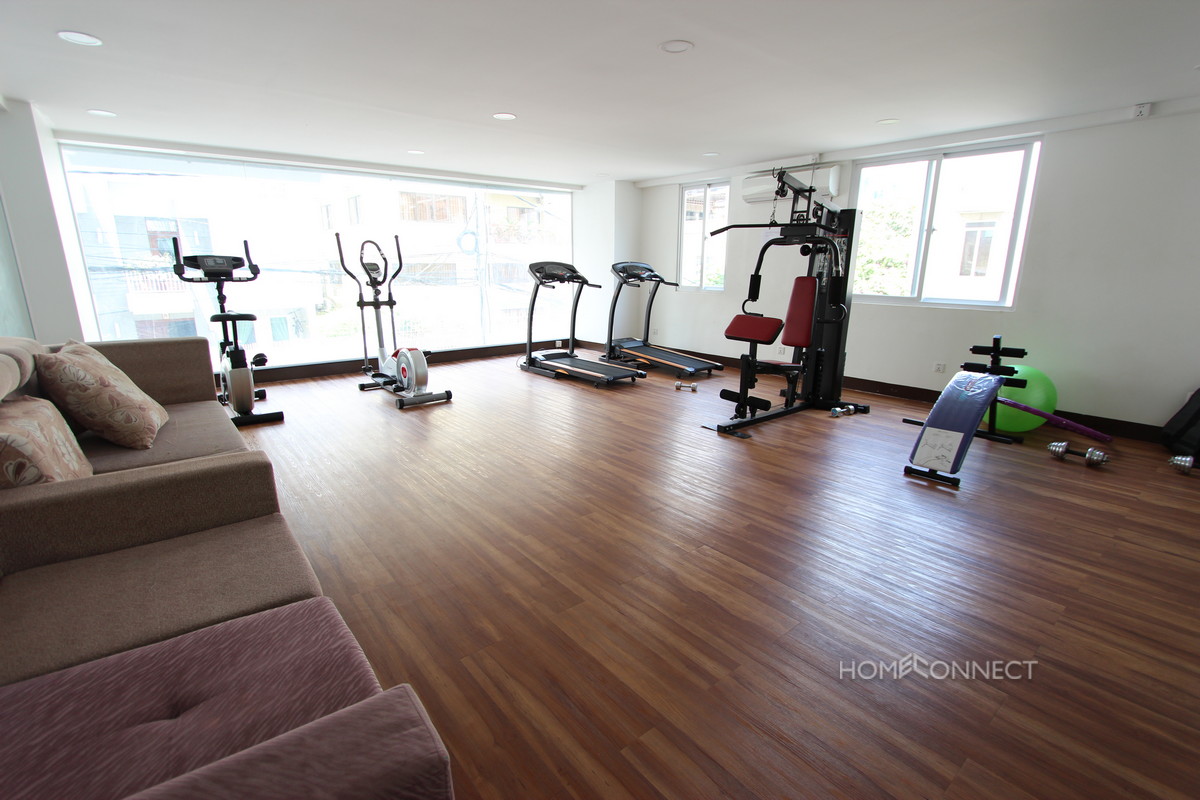 This apartment is located in a newly constructed apartment complex in the central district of 7 Makara, close to the Olympic Stadium and the commercial heart of Phnom Penh. The property features 2 bedrooms that adjoining open plan living area with a fully equipped kitchen. There is a small balcony off the living area to allow for some outdoor space. Secure parking is available and there is a gymnasium available for tenants use. Please Quote Property Code : PRE000535