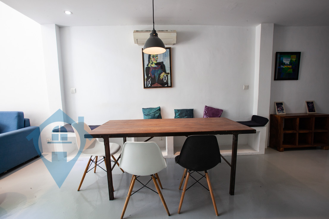This contemporary two bedroom apartment for rent is located in the central district of 7 Makara in the capital Phnom Penh. The property has a unique design and benefits from lots of natural light and one private balcony and a good sized private terrace. The apartment comes fully furnished and fully equipped. The apartment is on the 2nd floor and shares a stairwell entrance. There is secure parking for both cars and motos. Please quote property code : PRE001129