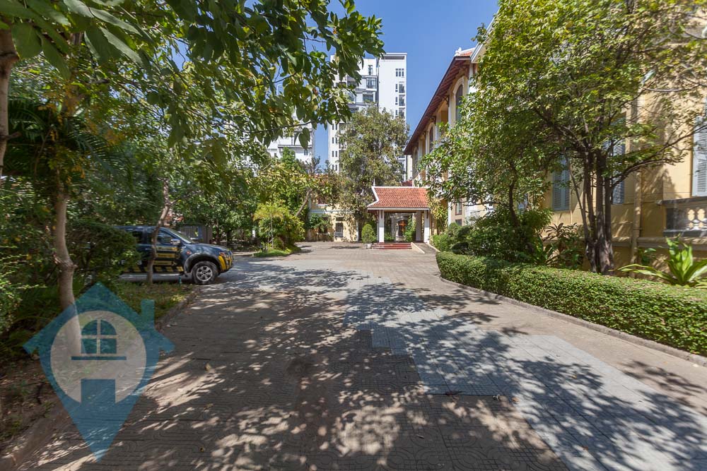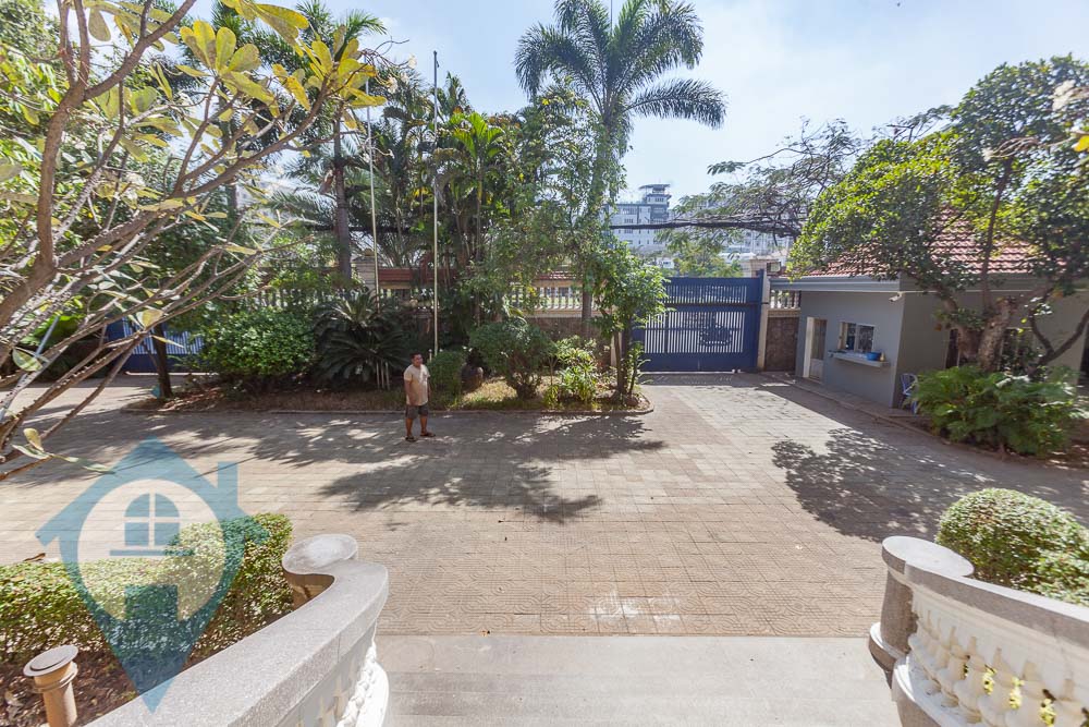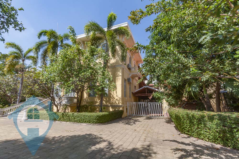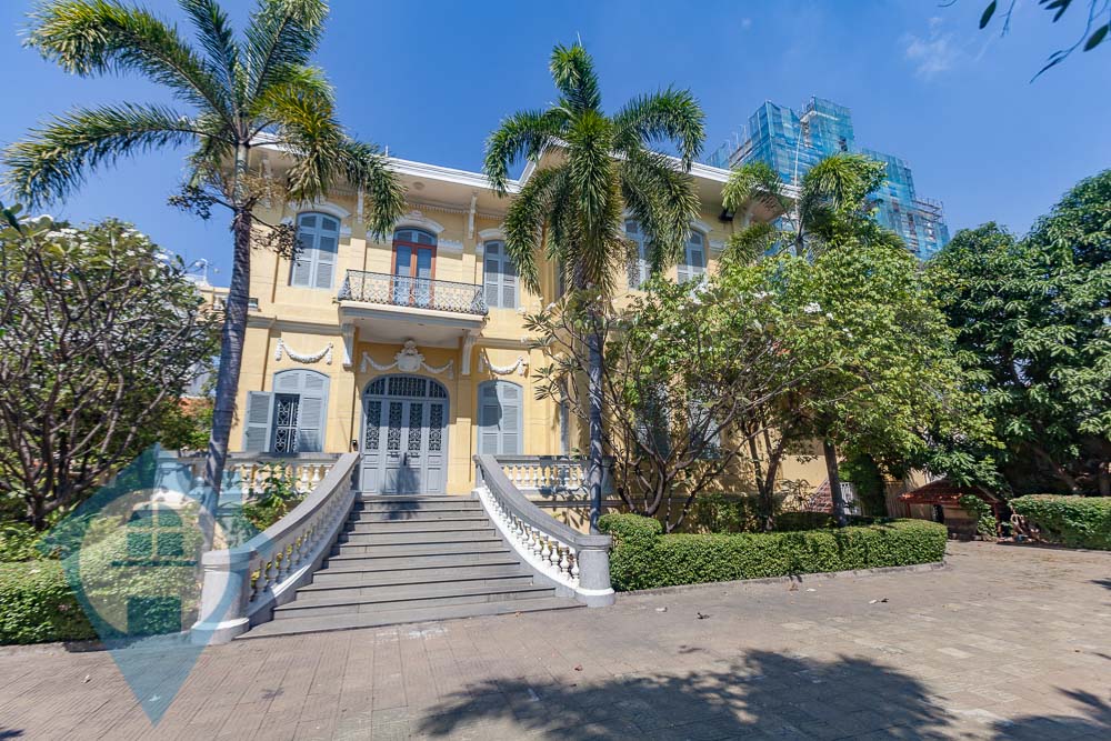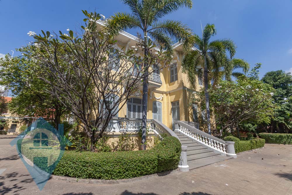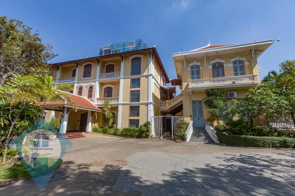 Nestled among lush trees on an expansive block near Independence Monument in central Phnom Penh, this grand colonial villa is now available for rent. With an air of opulence and luxury, it is ideally suited as a company headquarters, embassy, diplomatic residence, school, or even a hotel. Offering a truly colonial experience, the villa boasts original architectural features and an impressive 2000sqm of commercial space. It consists of four separate yet connected buildings linked by undercover walkways and provides ample parking space for over 30 vehicles. Its prime location ensures easy, secure access from two streets, with multiple entrance points and a guardhouse for added security. The interiors feature large, light-filled rooms, sweeping staircases, and numerous outdoor areas perfect for entertaining, complemented by meticulously manicured gardens and terraces. This extraordinary property combines rich historical charm with practicality, making it an unparalleled choice for various uses. Please quote property code : PRE002059