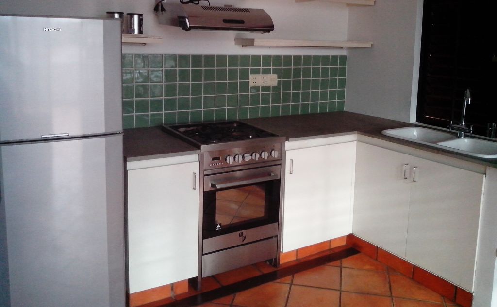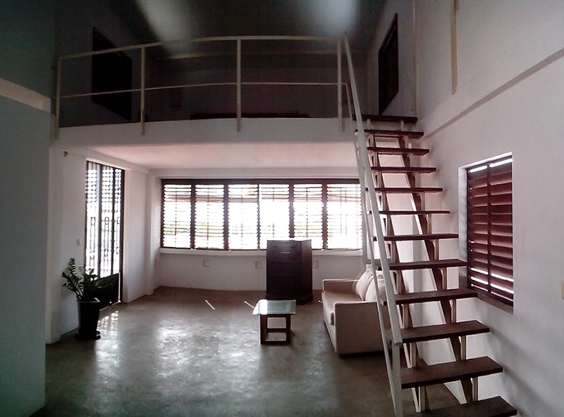 On 3rd floor, quiet, located near corner of street 110 and 19 (one block from Norodom blvd) Large living/dining area and terrace overlooking the city, sunny with cool temperatures. On 3r floor, large bedroom king size bed, dressing, private bathroom, air con, fan, sheets and towel On 4th floor, great living/dining area with polished cemented floor (sofa, coffee table, dining table, chairs, … ), large windows, a lovely bathroom and open kitchen view on the terrace. 2nd bedroom on mezzanine, standard high 2.30m and a king size bed, air con FURNISHED : lounge set, dining table, beds, mattresses, wardrobe, gas stove, oven, refrigerator with freezer, washing machine, kitchen wares, dishes, kettle, etc … (Access to the apartment is a common stair case in Cambodian neighborhood) Ref 021