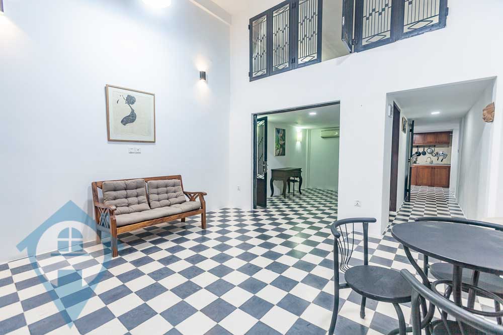 This ground floor one bedroom apartment is located within easy walking distance of the Royal Palace in Phnom Penh. The property comes with one bedroom and two bathrooms. The ground floor consists of a high ceiling living area and a separate dining room which could be used as a second bedroom if required. The building is located off a quiet street in a well lit alleyway. The kitchen is spacious and comes equipped. Please quote property code – PRE001785