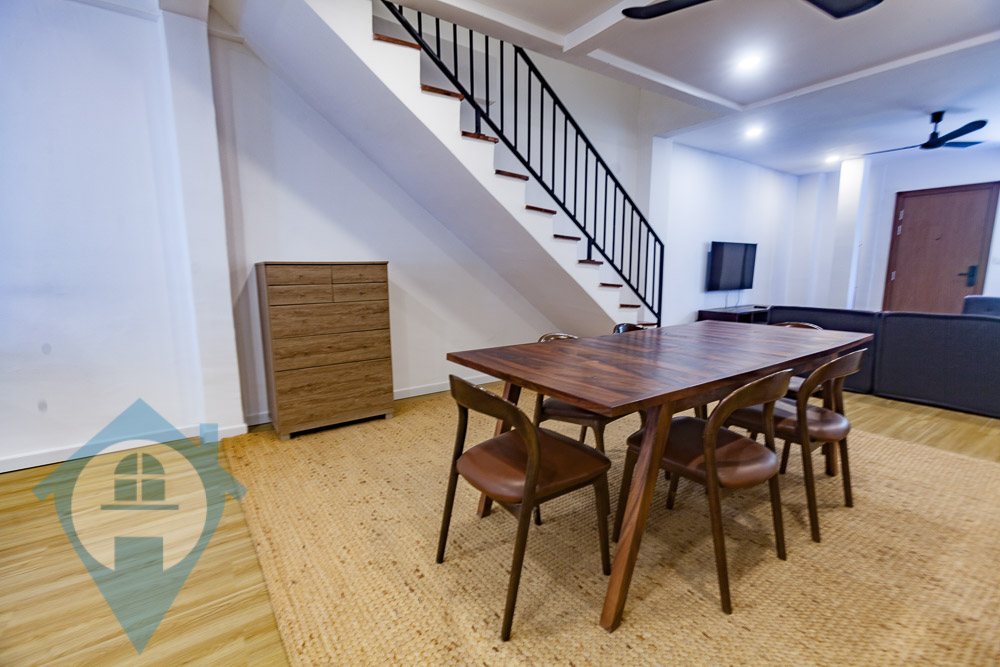 This two bedroom ground floor duplex apartment for rent is located within walking distance of the landmark Royal Palace in the Daun Penh district of Phnom Penh. The apartment comes with two bedrooms and two bathrooms and has a spacious private courtyard. The building is a renovated older building brought up to modern standards. There is secure parking for motos and the building is in a quiet expat area. Please quote property code : PRE002214 For more info or a viewing please contact Bobby - WhatsApp / Telegram +85577424840