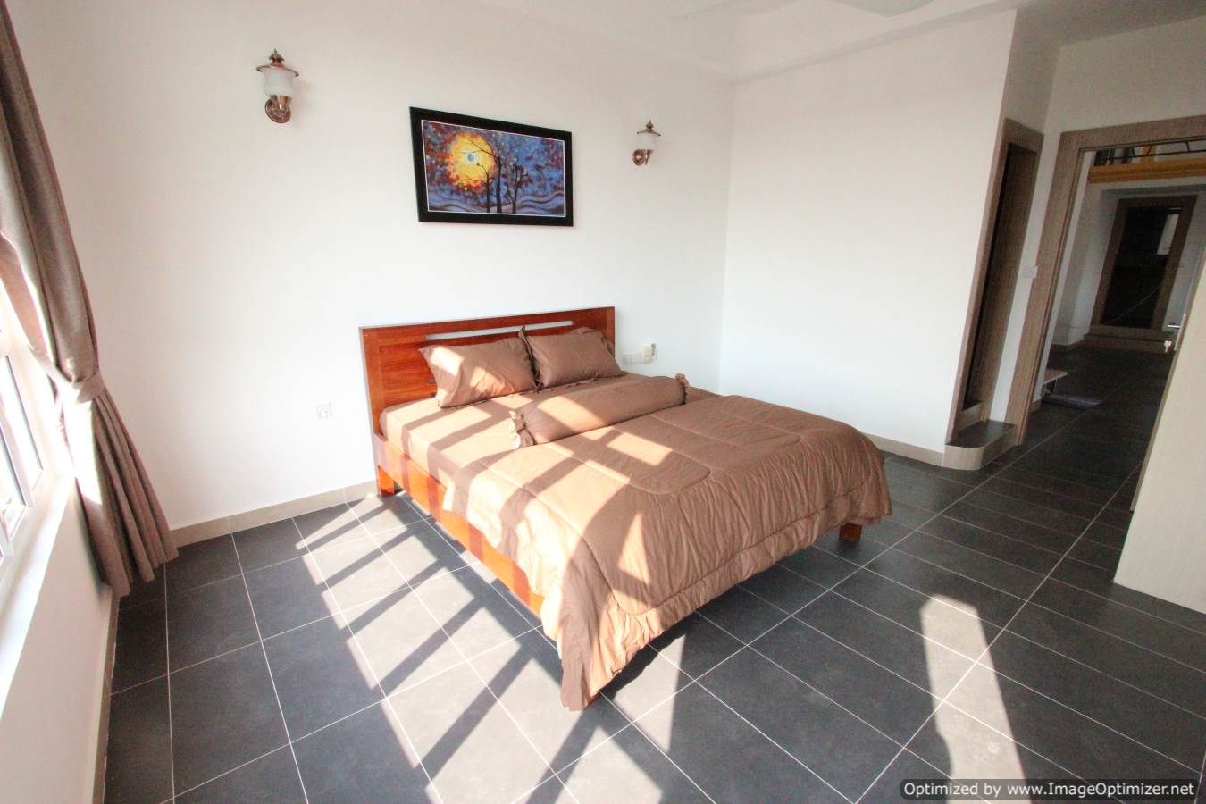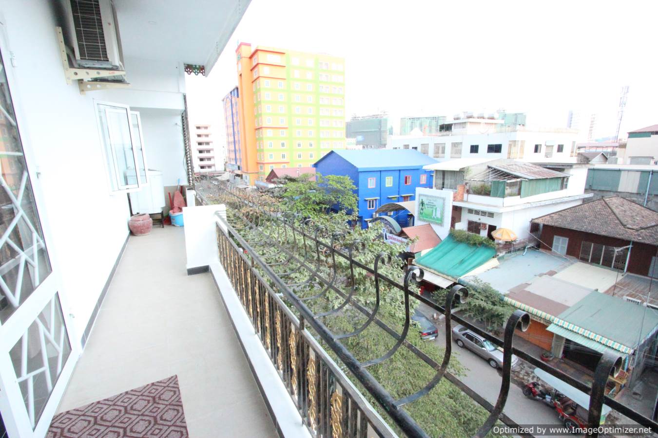 This newly renovated apartment occupies the top two floors of a corner site building near Olympic stadium Phnom Penh. The apartment comes with three large bedrooms and three bathrooms had has a double height ceiling in the extensive living space. There are two balconies off each guest bedroom and a large terrace leading off the master bedroom. The apartment has been extensively renovated to a high standard including a modern fitted kitchen, fitted bathrooms and stylish furniture.