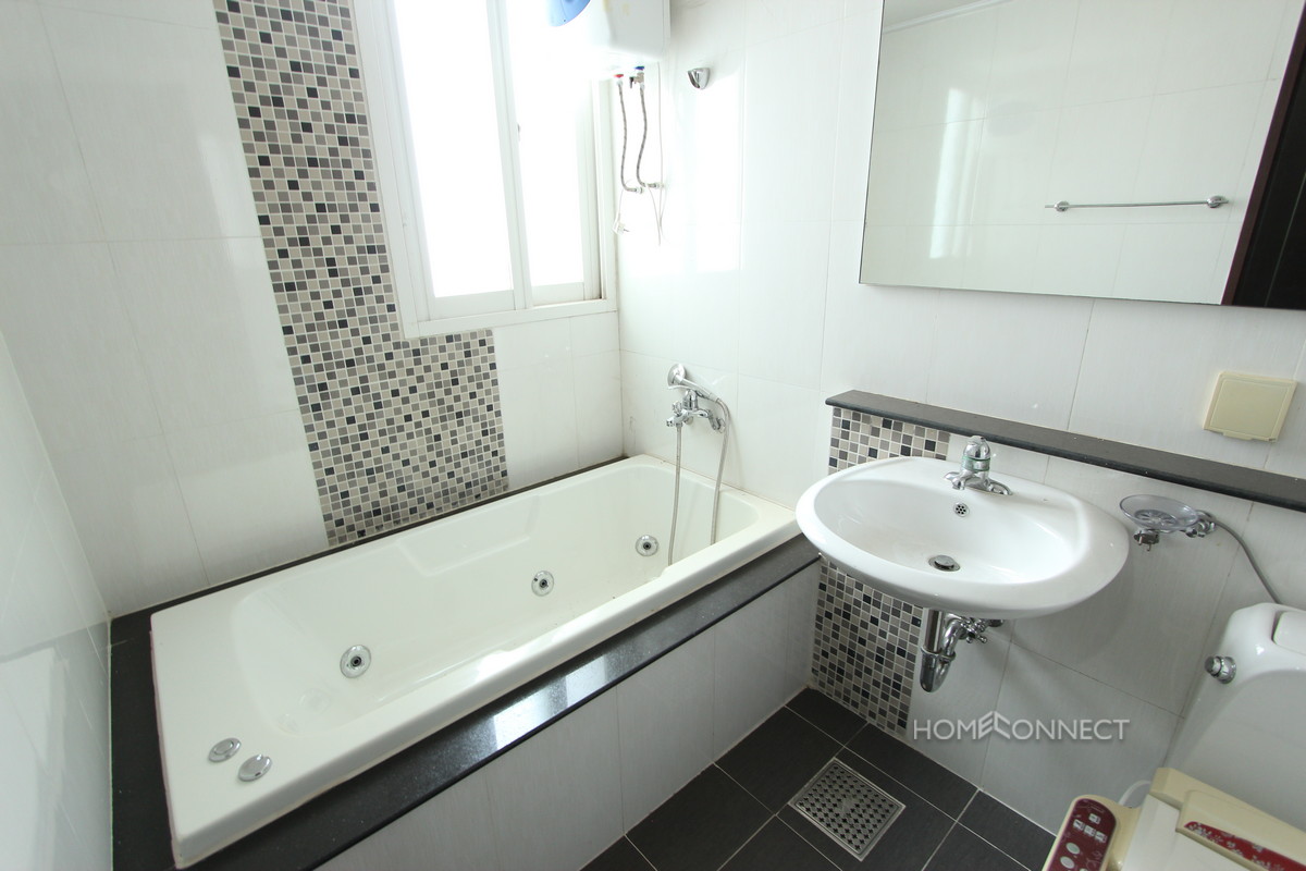 This three bedroom apartment is located in a large condominium building in the western district of Toul Kork. The apartment features an open plan living area with a full equipped modern kitchen. There is a balcony off this lounge area which provides sweeping views of western Phnom Penh. The bedrooms are spacious and the master comes complete with an ensuite. The complex has gym facilities and a pool for tenants use. Property Code : PRE000317