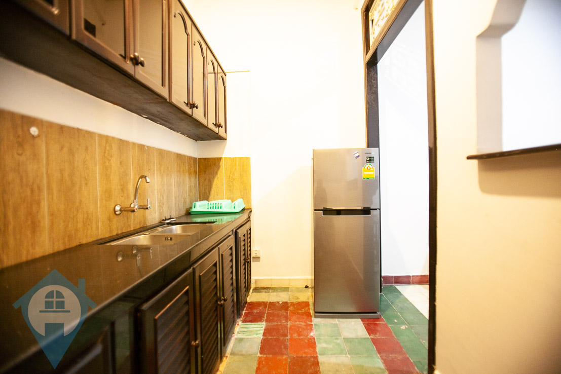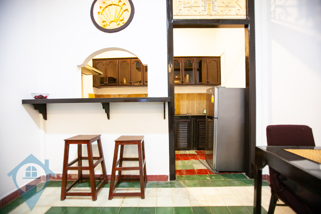 This large balcony two bedroom apartment for rent is located close to Independence monument in the Daun Penh area of Phnom Penh. The property comes with a good sized swimming pool and gym plus secure parking and 24hr security. The apartment is in a converted villa and although comes with a modern kitchen and bathrooms retains many of its period features. The unit is fully serviced and has an experienced management team on site. The private terrace is large enough to house a table and chairs allowing for outdoor living. Please Quote Property Code : PRE000713