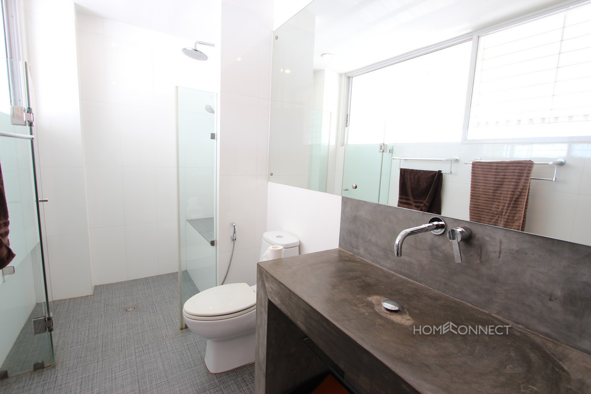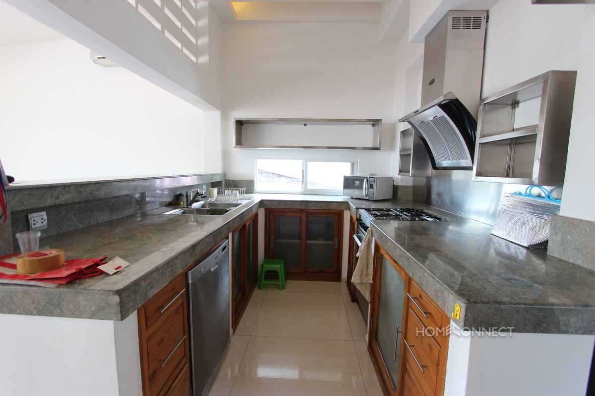 This 3 bedrooms duplex (160 m2) is in the city center between the train station and the river side. This corner propriety has a huge terrace facing the Park between the street 106 and 108 facing Wat Phnom and ministries. This 2 floors airy property is with two big outdoor half covered terraces on both floors. We access the duplex though a clean staircase opened from afront entrance locked at night. The dining room, the living rooms and the kitchen are opens on the front terrace of 50 m2. The kitchen is totally equipped (cabinets, microwave, stove top, oven gas, range hood, double sink and even a dishwasher). The first bedroom has its own bathroom. This room wall could be totally opened to be used as an extension for the living room or closed to keep as a room. The open stairs connect the second floor where there are 2 large bedrooms open on a private terrace (55m2) with a 4 seats Jacuzzi and an outdoor shower. The bedrooms share a big bathroom accessible through another room which could be used as an office or a playground. The property is renovated by a Swiss architect on European standards. It is fully furnished. The electricity is fixed on Khmer price. A solar water heater is installed for electricity saving. All french windows have electric roller shutters for privacy and security purposes. Property Code : PC000259