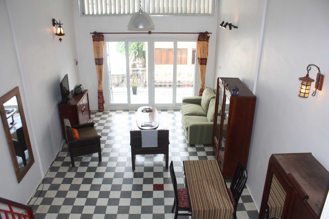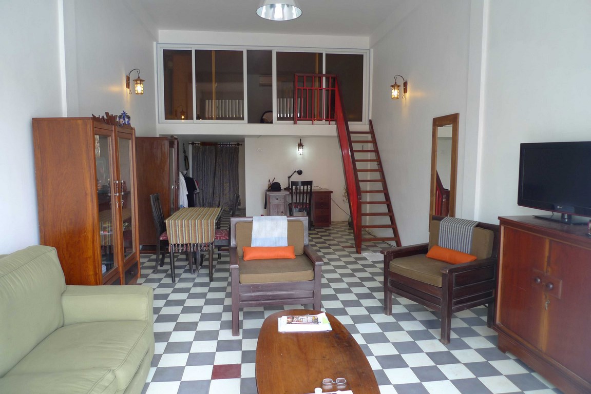 On the 2nd floor, living and dining area with a large sliding door on the front with a lot of natural light, a nice balcony, spacious bathroom and a separate toilet with sink. Furnished with washing machine, 32inch flat screen tv, original tiles, decorated with a mix of modern and antique furniture provides an intimate home. Centrally located, near Monivong blvd, in a quiet street, between Bayon Supermarket and Thai Huot Market. Possibility for car park and motorbikes, next to the apartment. Lease minimum 1 year Electricity, low rate: 850 riels = 0.21 $ per kw available May 1st, possibility to view anytime Access to the apartment is a common stair case in Cambodian neighborhood Contact by email : English or French Contact by phone : English or French or khmer