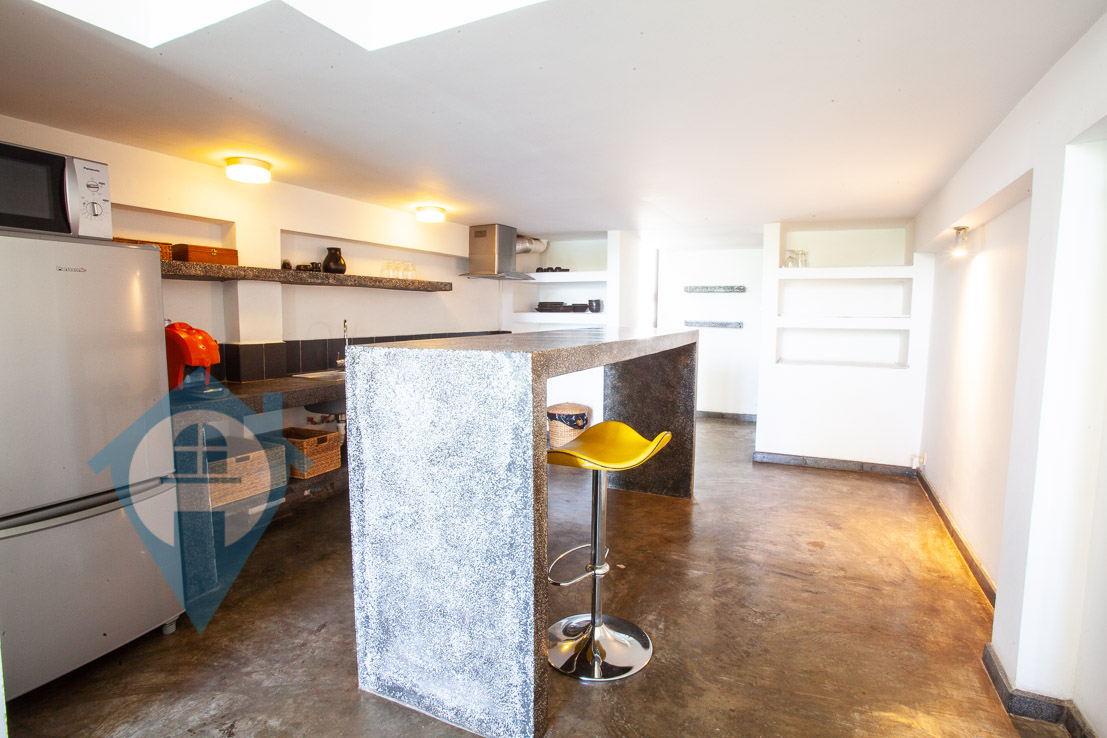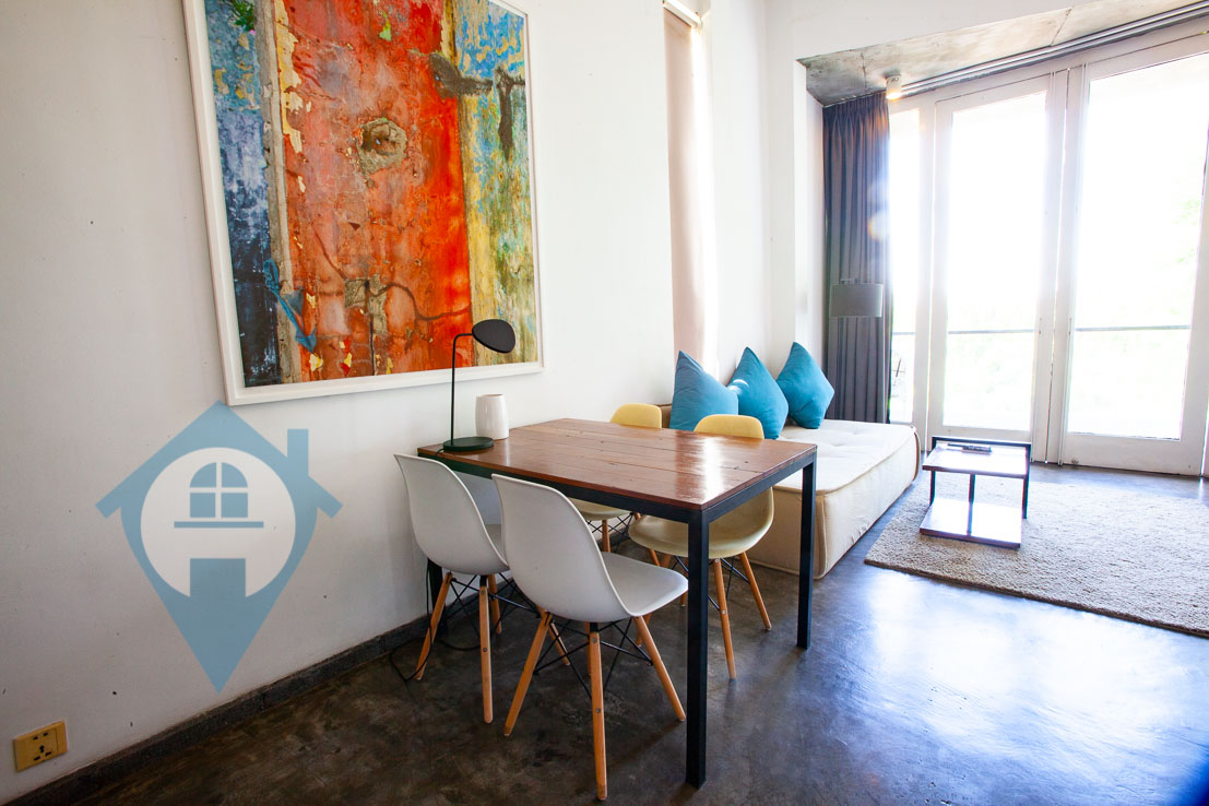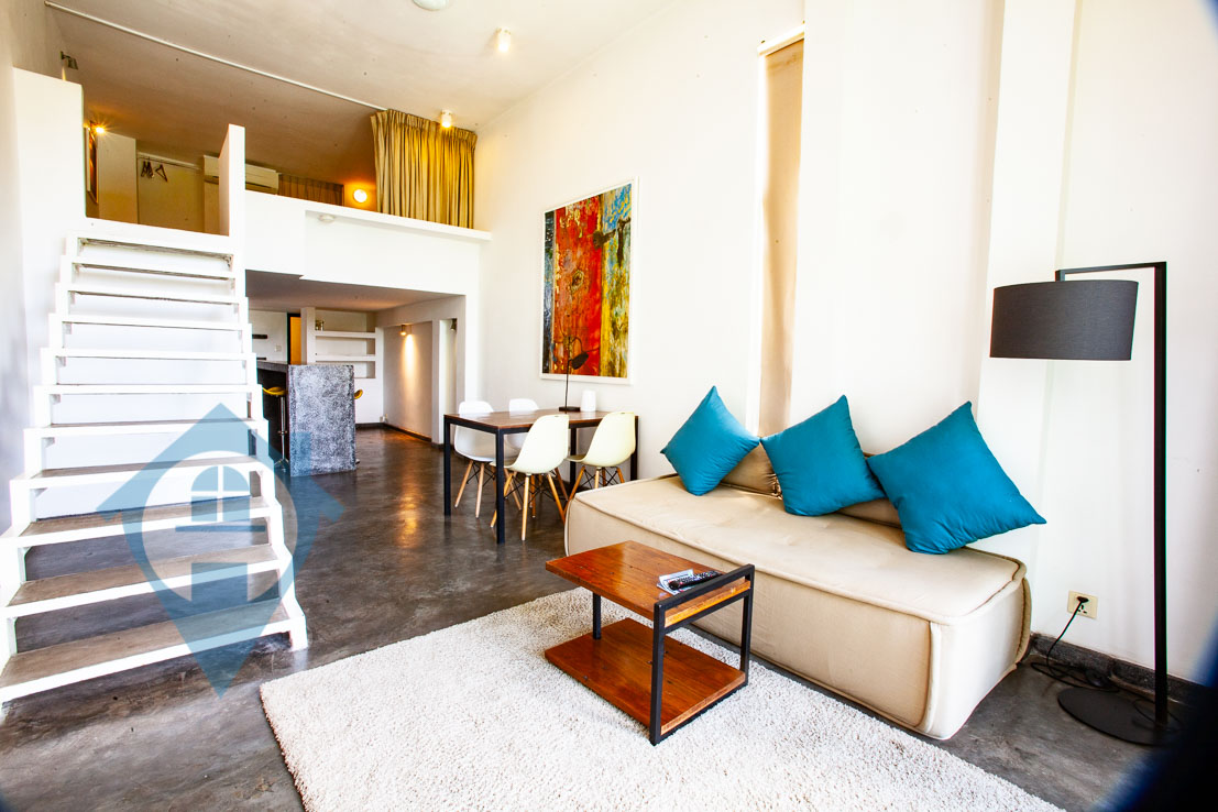 This modern one bedroom apartment for rent is located on the popular street 240 close to Independence Monument in Phnom Penh. The apartment is in the loft style with high ceiling in the living area. The property comes with one bedroom and two bathrooms. The entrance is clean and secure and straight off the street. Communal parking is available close by. Please quote property code : PRE001347
