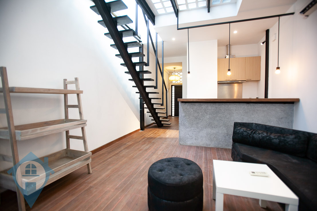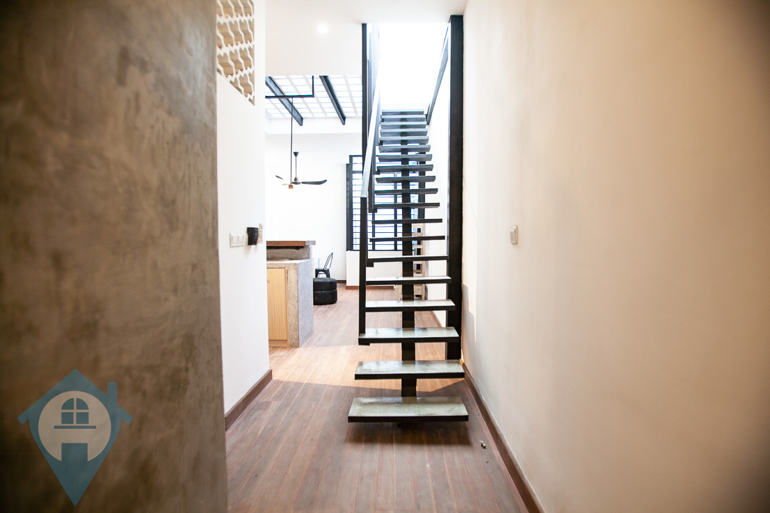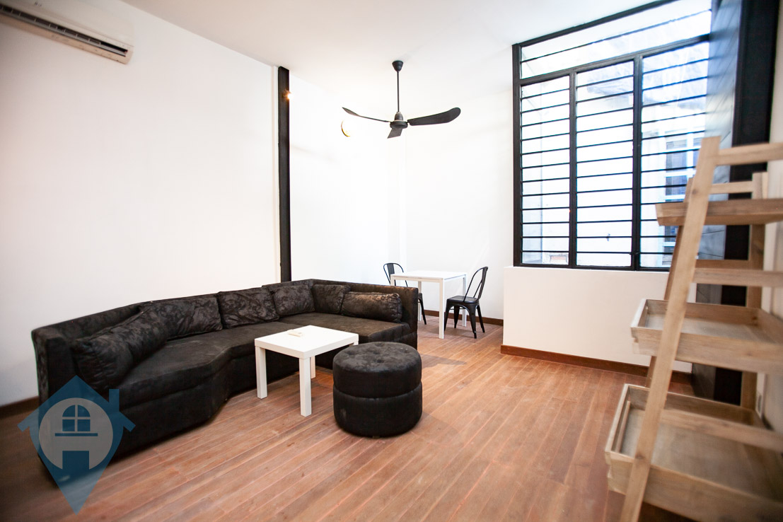 This stylish modern two bedroom apartment for rent is located on street 19 close to the cross street 136 in the Riverside area Phnom Penh. The property has lots of natural light and the interior finish and furnishings are of a modern western style. Parking for moto’s is available close to the apartment and local supermarkets / shops etc are located close also. This apartment is a duplex located over the 4th & 5th floors. Property Code : PRE000408