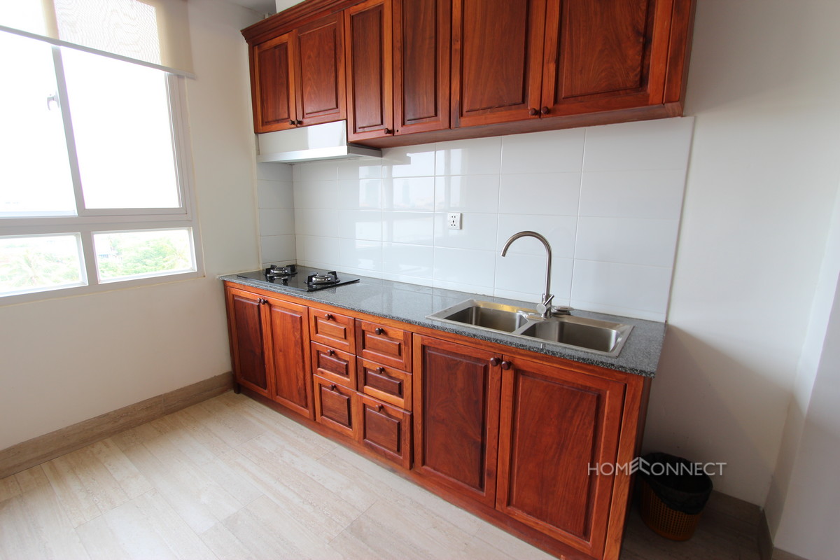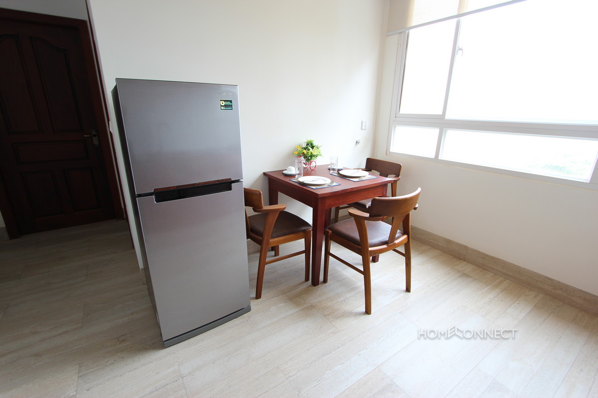 This studio apartment is located over the Japanese Friendship Bridge in the eastern district of Chroy Chongva. It features a rear separate kitchen and small dining area which leads to a large open plan living/bedroom. There are frontal bay windows that provide sweeping views west towards downtown Phnom Penh. This apartment comes serviced and there is a mini-mart and gymnasium located on the ground floor. PRE000314
