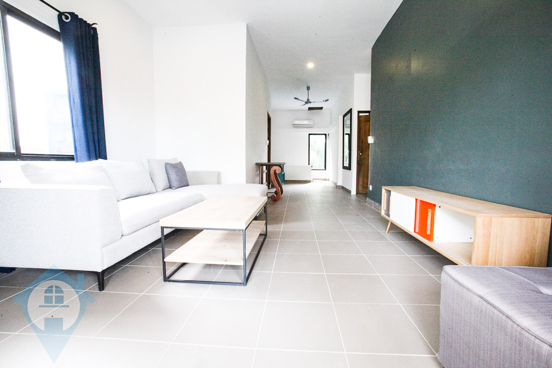 This family sized four bedroom villa for rent is located close to the landmark Royal Palace near Riverside in Daun penh, Phnom Penh. The villa has been newly renovated in the western style and comes fully furnished. There is a mixture of decking areas leading onto a large private swimming pool. The site has secure car and moto parking. The villa comes with four good sized bedrooms each with its own private ensuite. This villa would be perfect for family living and the interior design is both bright and airy. There is a study room which could easily be used as a 5th bedroom or playroom if required. Please quote property code : PRE001108