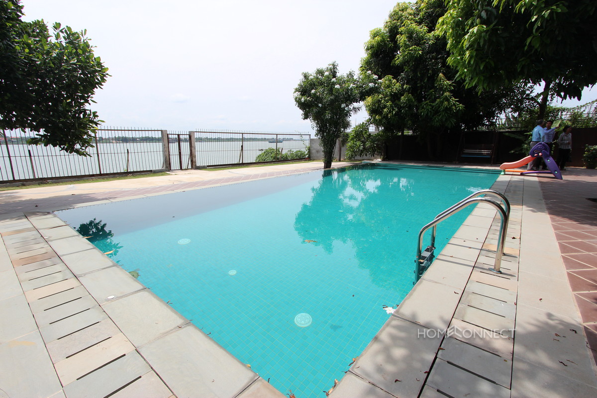 This stunning five bedroom villa for rent in Chroy Chongva comes with its own private river frontage and private swimming pool. The villa is finished in a western style and with lots of windows is both bright and airy. The mature garden extend to a large private river frontage with uninterrupted views of the Mekong river. The villa is close to the bridges meaning the commute to the city is a short one. The property also has good sized terraces meaning you have a selection of outdoor spaces to enjoy the view and the river. Please quote property code : PRE000711