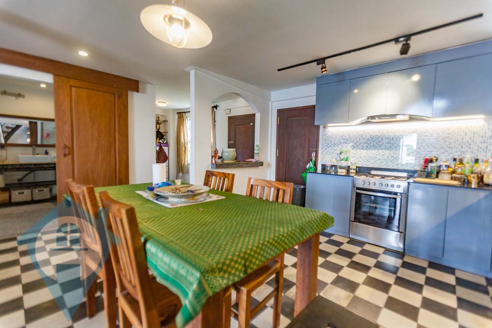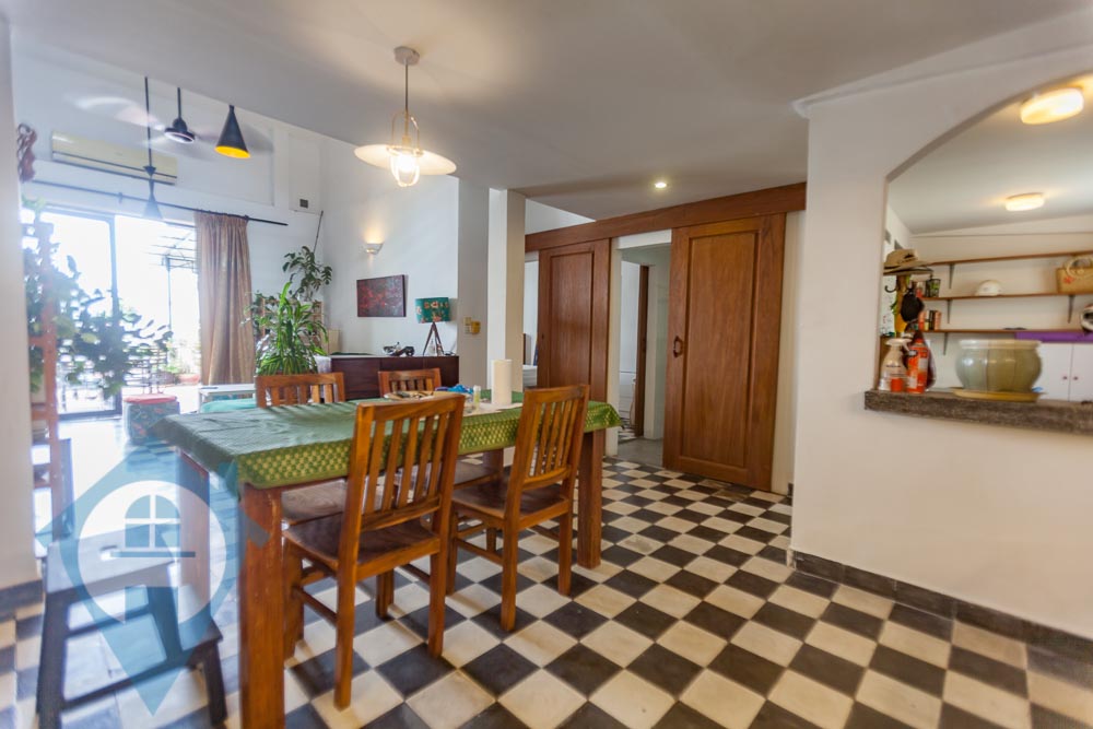 This elegant two-bedroom duplex apartment is now available for rent in a desirable location close to the French Embassy and Lycée français René Descartes de Phnom Penh. The property has been renovated to a high standard and features a spacious terrace with views towards Riverside. The entrance is a shared stairwell entrance and the property is on the 3rd floor. The first level comprises of a bright and open living room with contemporary design, high ceilings and natural light throughout. This elegant dwelling also features a fully-equipped kitchen, two bathrooms with designer touches, The electric is government EDC rates. Please quote property code : PRE001886