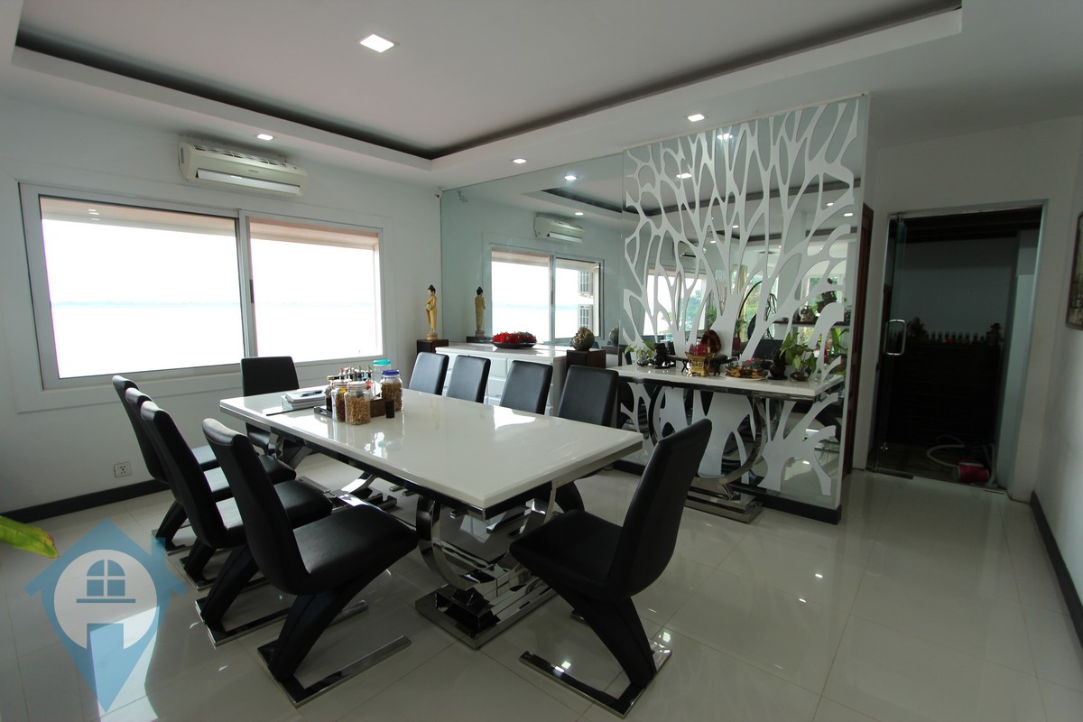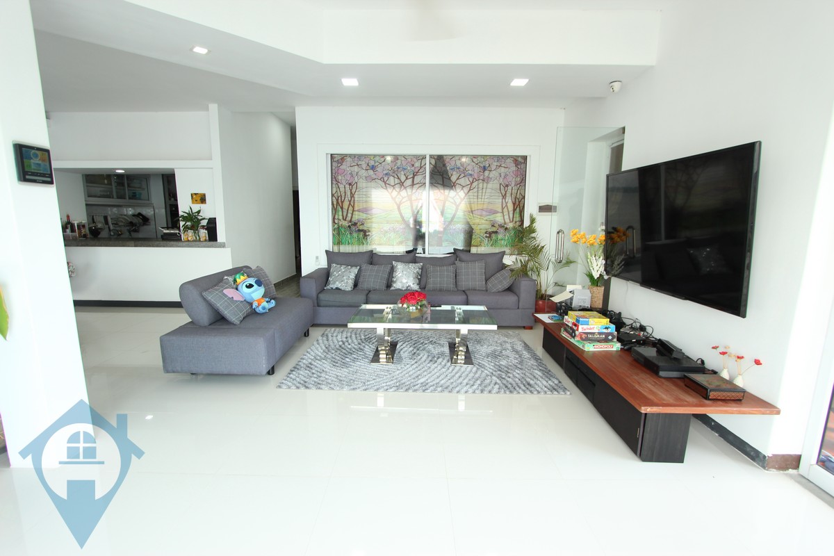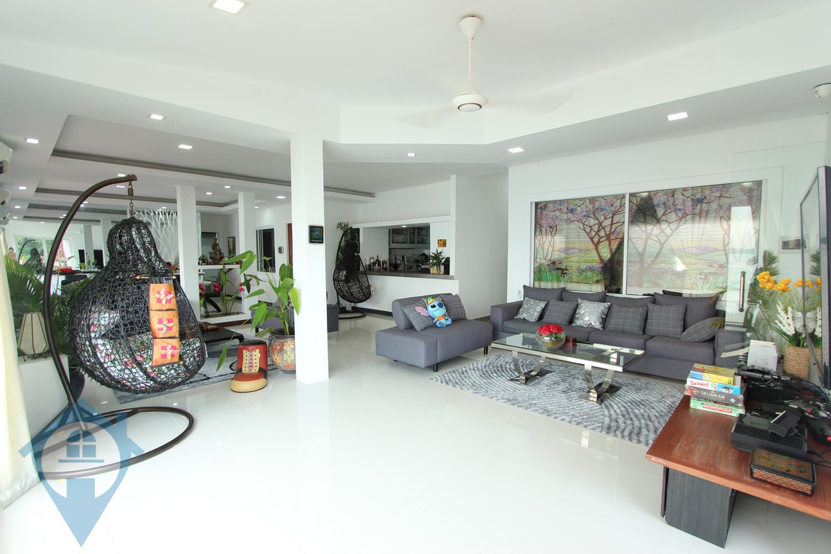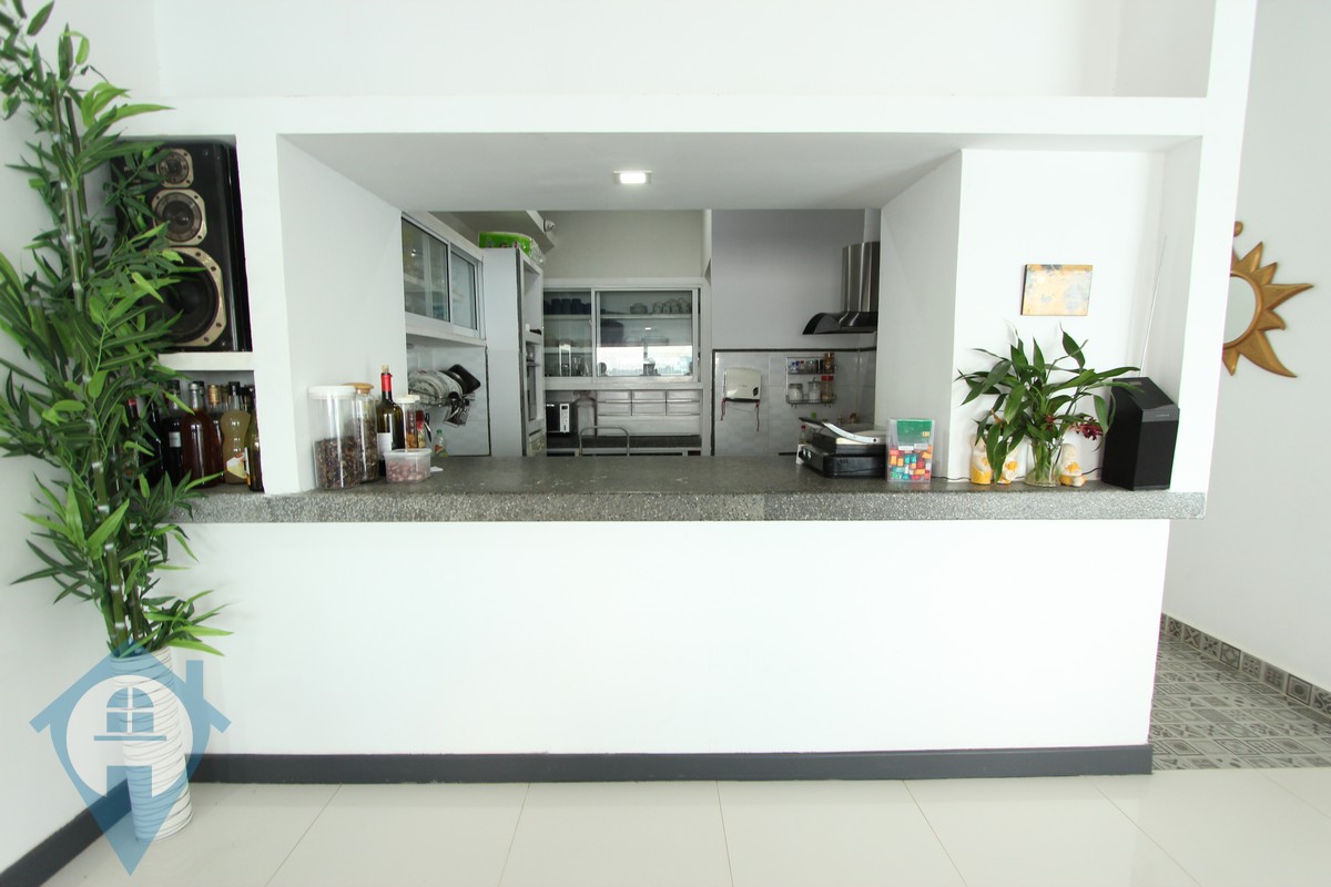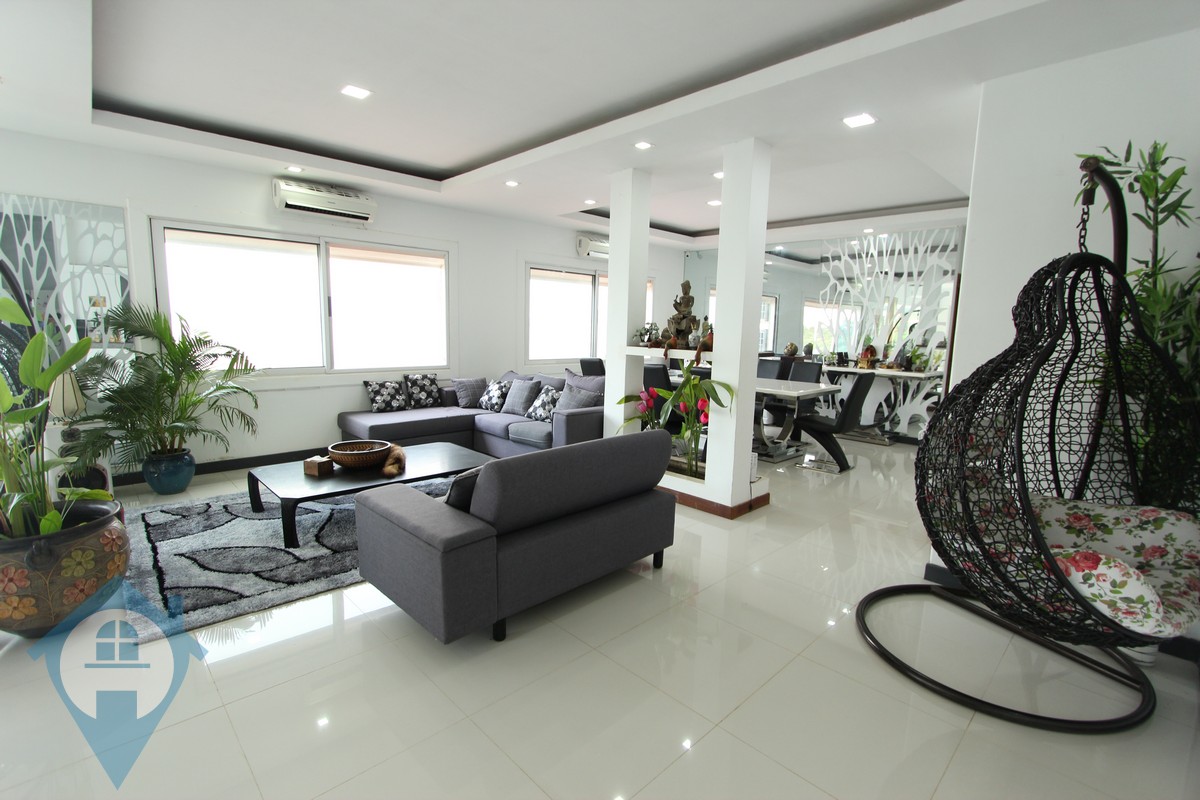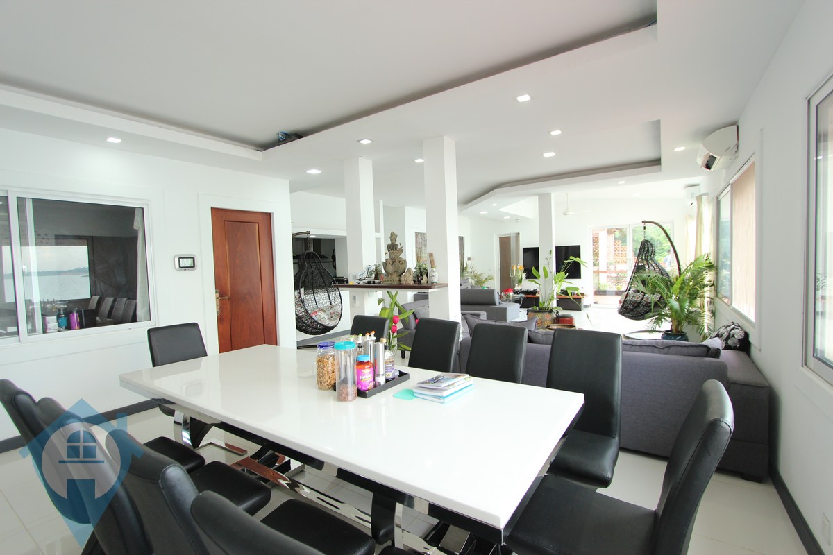 This spacious four bedroom apartment for rent situated on the beautiful Mekong river in the ever popular area of Chroy Chungva in Phnom Penh. The unit is set on the first floor of a secure compound with open gardens that run down to the private stretch of the Mekong. This apartment has a large private terrace with panoramic views over the Mekong river. The inside of the apartment is modern and very bright with natural light coming in through large windows overlooking the river. The compound is shared with other expat families and has secure parking for both cars and motos and 24 hour security. Please quote property code : PRE000997