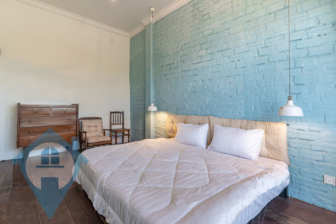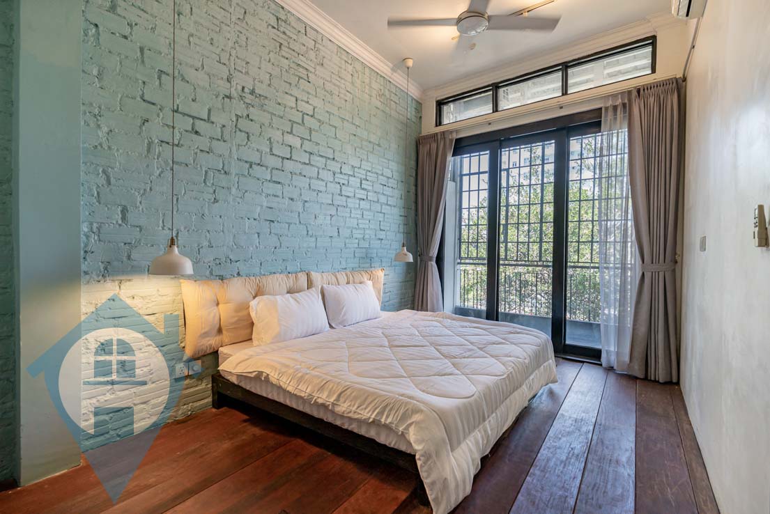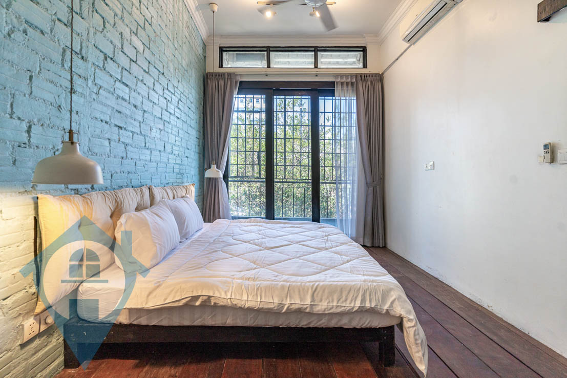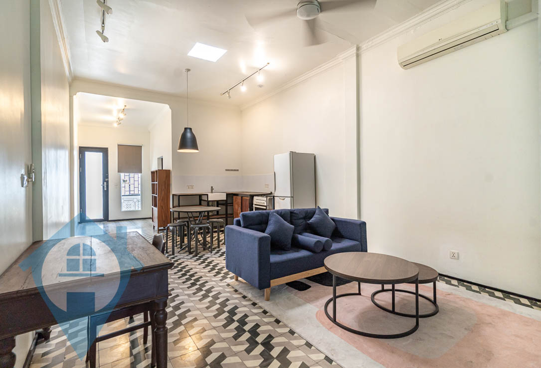 This charming one-bedroom apartment is perfect for those who appreciate a rustic atmosphere and wish to experience post-colonial living in Phnom Penh. Situated on the third floor of a Chaktomukh shophouse, it is now available for rent and comes semi-furnished. The main hall is air-conditioned and features a modern sofa set with a coffee table, a mounted flatscreen TV, and a fully-equipped kitchen complete with a refrigerator, a four-burner stove with an oven, a percolator, and a built-in sink, along with plenty of pantry space. The bathroom is uniquely designed with a sink-and-mirror setup, a well-lit bathtub, and a large frosted window. The bedroom has a separate air-conditioner and is furnished with a large bed, a bedside table, a lounge chair, and a simple dresser. Both the main hall and bedroom are equipped with ceiling fans for added comfort. Conveniently located, this apartment is within walking distance of Chuong Sok Clinic, Le Street Café, and the International Book Center, while also being two minutes from Café Amazon, the Australia Center for Education, and the Independence Monument, and just seven minutes from Aeon Mall, Prestige Hospital, and Build Bright University. Please quote property code : PRE002070