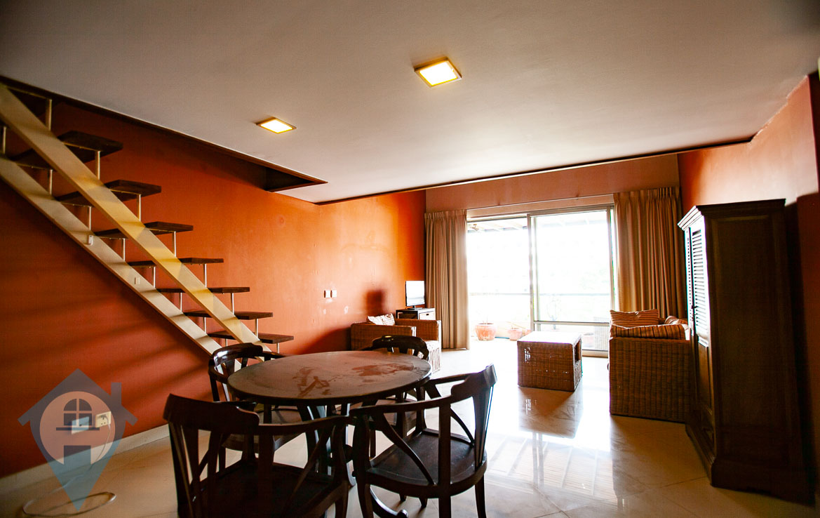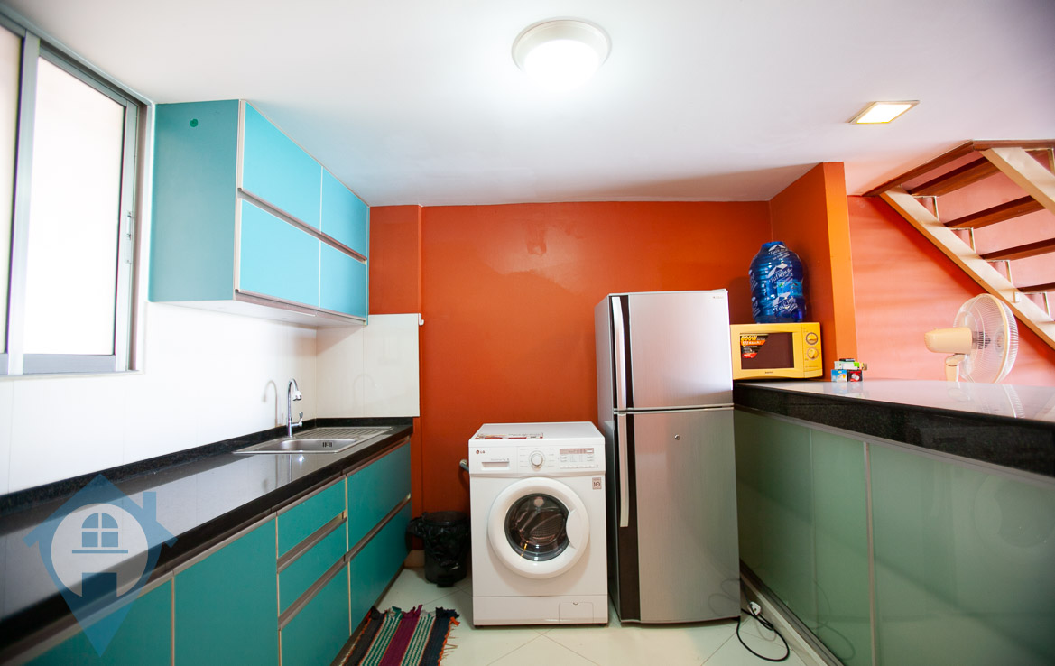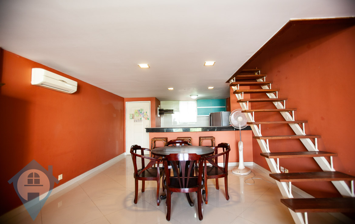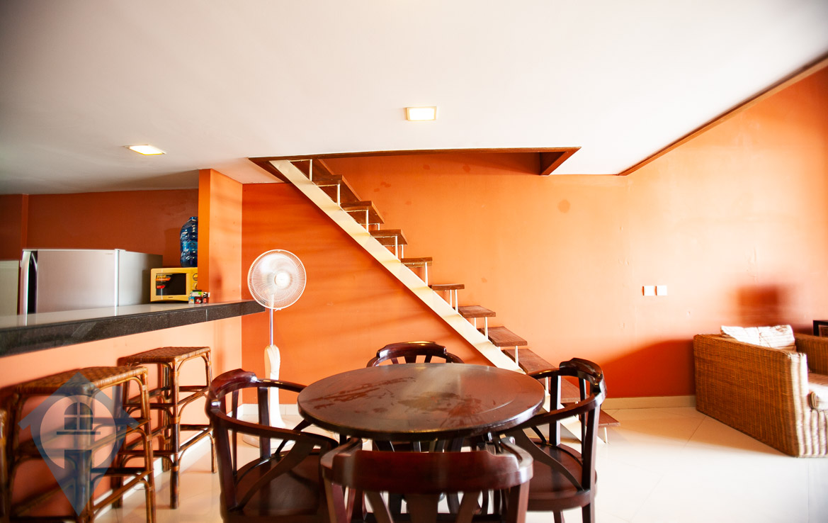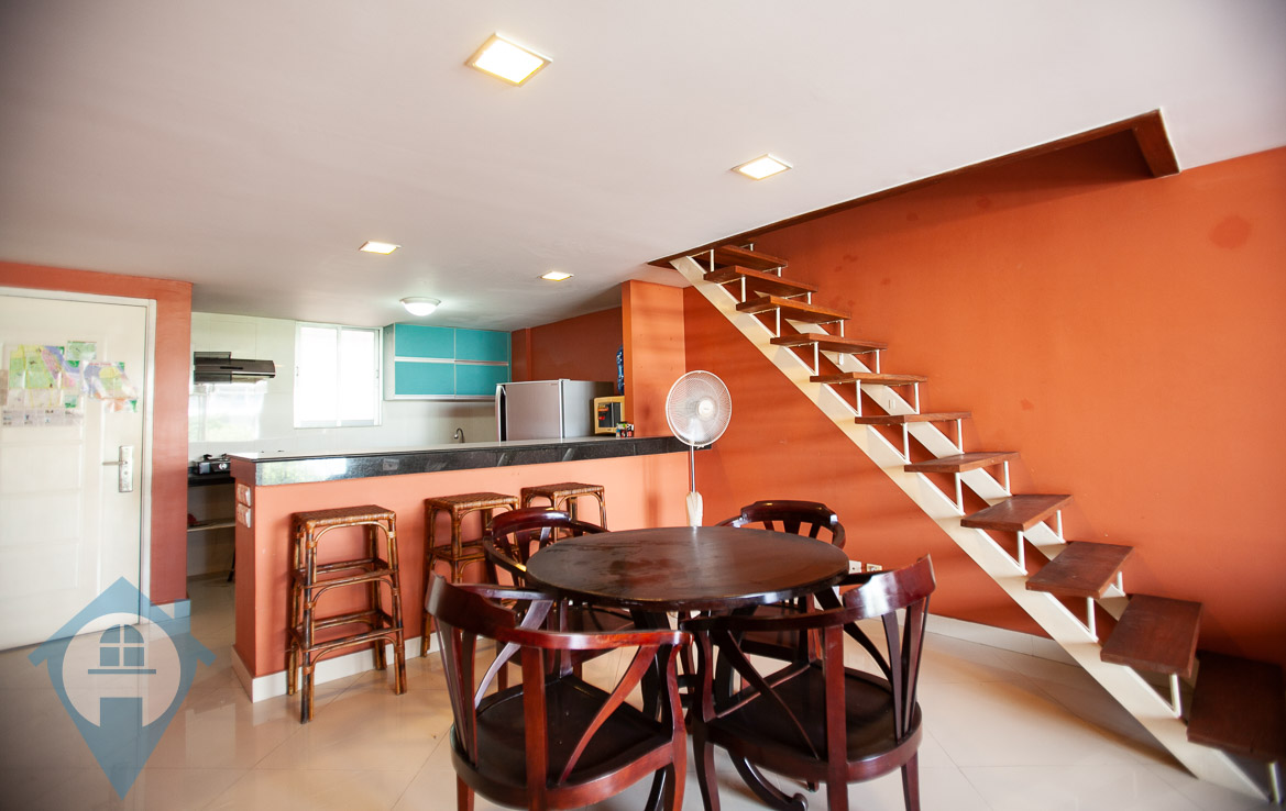 This renovated one bedroom apartment for sale is located on a popular street near the iconic riverside in the capital Phnom Penh. The apartment is a duplex with the main floor being 65 sqm, the mezzanine being 22 sqm and a balcony of 8 sqm. The property comes furnished and is located on the 3rd floor. This property has a soft title. Please quote property code : PRE001186