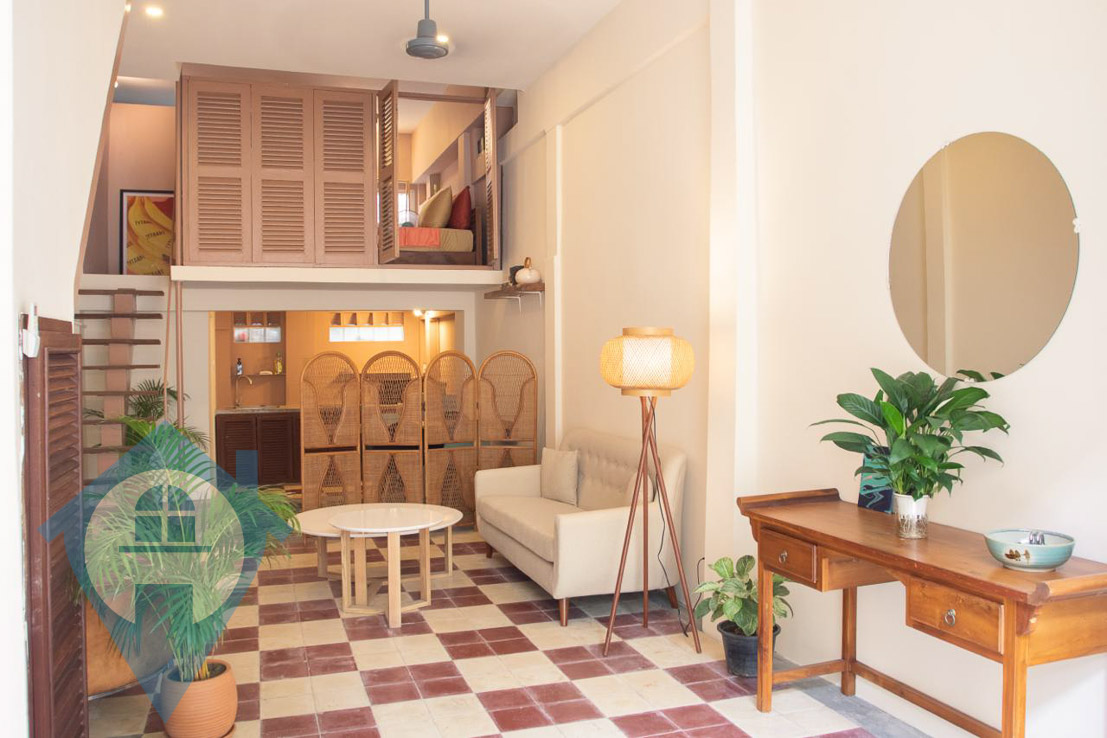 This unit features an eye-catching green couch positioned next to a wooden dining table and vibrant, colorful chairs, creating a lively and welcoming atmosphere. Fully furnished with additional furniture and appliances, it ensures a quick and hassle-free move-in experience. Conveniently located, it is just a three-minute walk from Pencil Supercenter and the Chaktomuk Conference Hall, a two-minute ride from Aeon Mall, five minutes from Boeung Keng Kang Market, and eight minutes from Preah Ang Duong Hospital. The total floor size is 58 sqm, including a 13.7 sqm mezzanine. The lease term is one year with a two-month deposit, and paid services such as WiFi, cable TV, and housekeeping are included. Pets are negotiable, making this an ideal choice for a comfortable and convenient lifestyle. Please quote property code : PRE002122