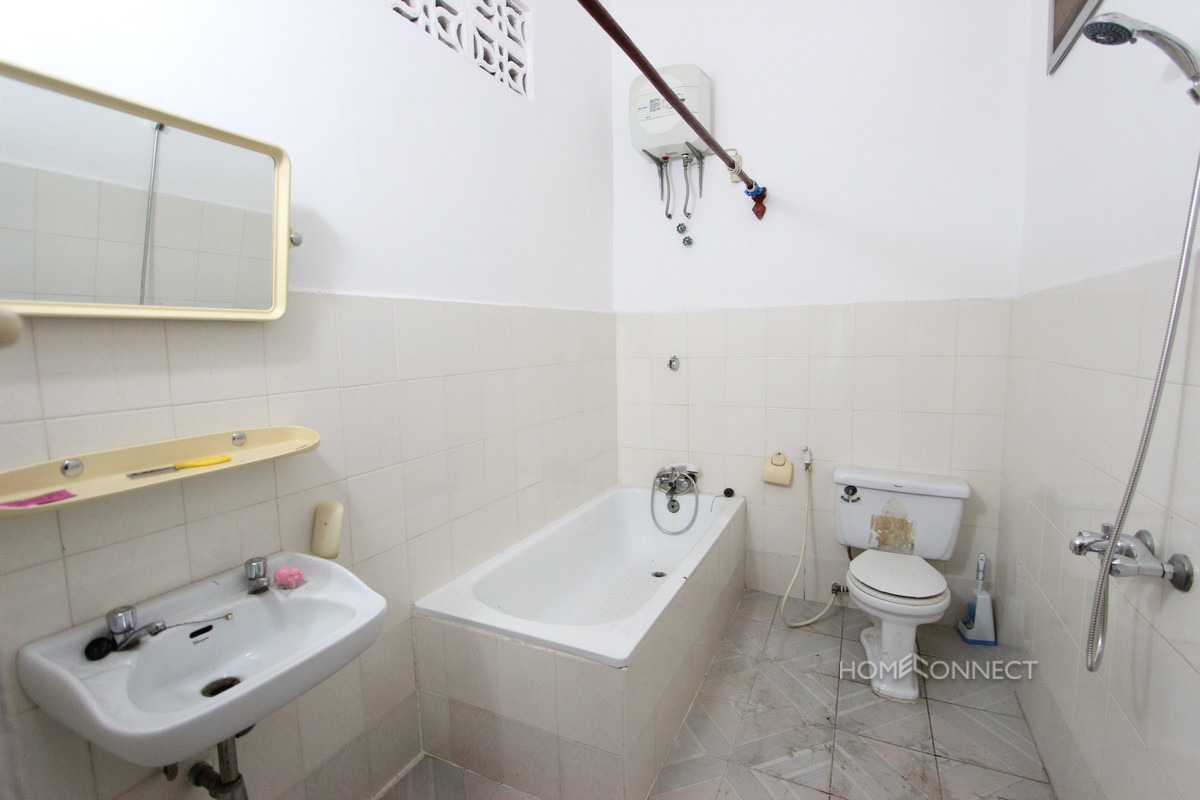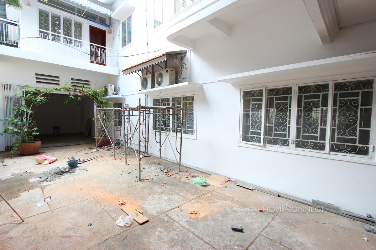 This villa is located on a quiet street in the central district of Tonle Bassac, close to the Independence Monument and Riverside areas. Currently undergoing some renovation, this villa consists of a total of 4 bedrooms and a large living area on the ground floor. The rooms are well lit with abundant windows and there is a large terrace on the upper floor that would be great for entertaining guests. The villa is set in a large plot and is surrounded by gardens that contain a lap pool. Property Code : PRE000499