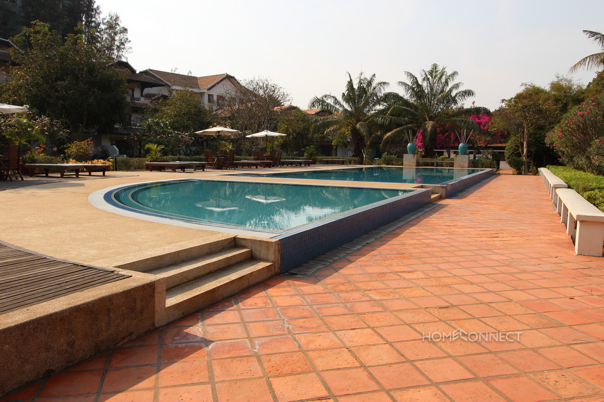 This fully furnished apartment is located in one of Phnom Penh’s modern gated communities, to the south of central Phnom Penh. The apartment has a total of two bedrooms, two bathrooms and a large open plan living room. There is a separate fully equipped modern kitchen. The property is located in a large gated community that shares large landscaped gardens, tennis courts, gym & pool and a restaurant/bar. All of this is located on the banks of the Bassac River and would be perfect for a small family new to Cambodia. Property Code : PCOOO200