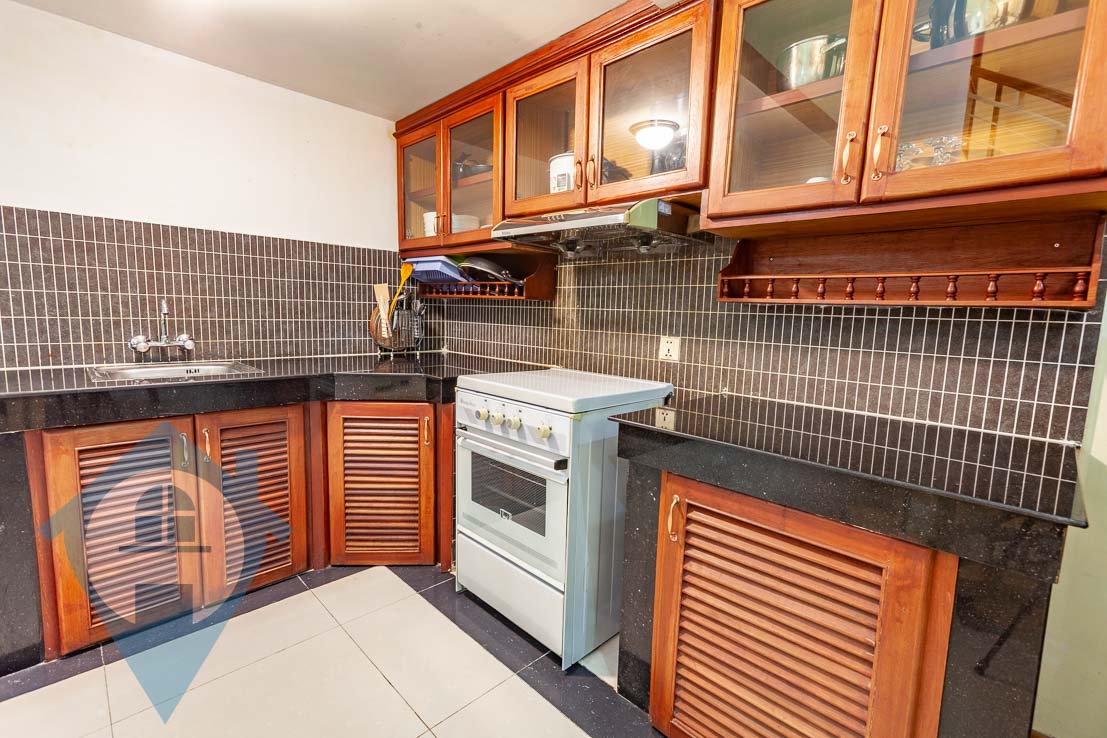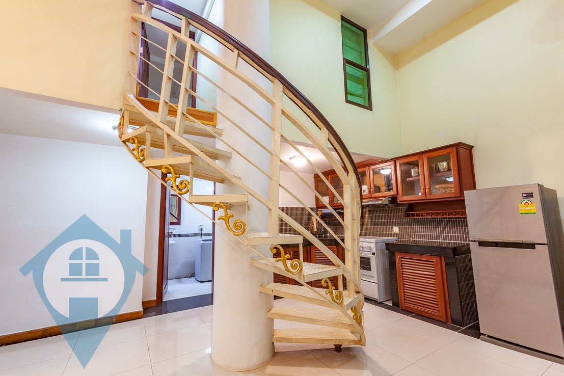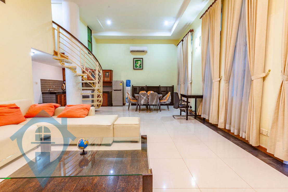 This spacious ground floor three bedroom apartment for rent in located in the popular Wat Phnom district in the north of Phnom Penh. The apartment has three bedrooms and three bathrooms and is bright and airy. There is a fully equipped kitchen and a large living area with a high ceiling, one downstairs bedrooms and a spiral staircase leading to two upstairs bedrooms.. The building has secure parking for both cars and motos, 24 hour security, swimming pool, spa and gym. This building is within walking distance of the French / British & American embassies as well as Lycée français René Descartes. Please quote property code : PRE001716