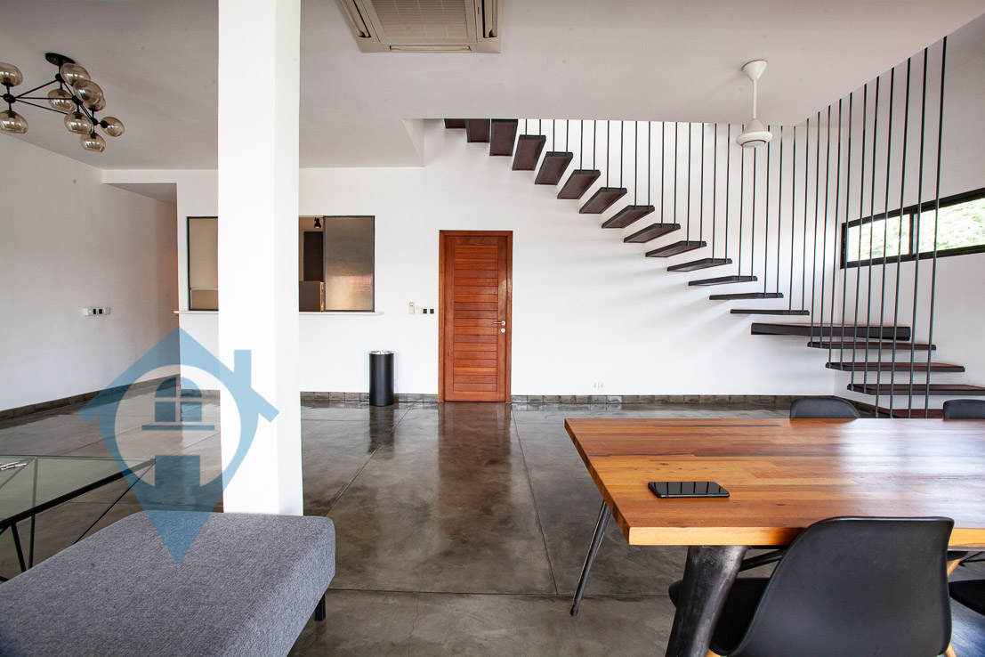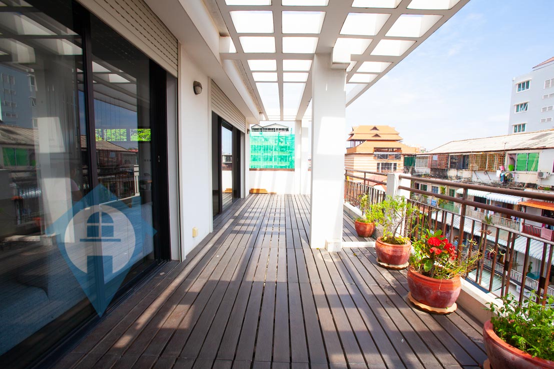 This spacious three bedroom apartment is located within walking distance of the iconic Royal Palace in Phnom Penh. The duplex comes with three spacious bedrooms all with en-suites and a fourth guest bathroom. The apartment is on the 3rd and 4th floors and both have private terraces. The property has a clean and secure entrance and an elevator. Communal parking for both cars and moto's is available close by. Please quote property code : PRE001388