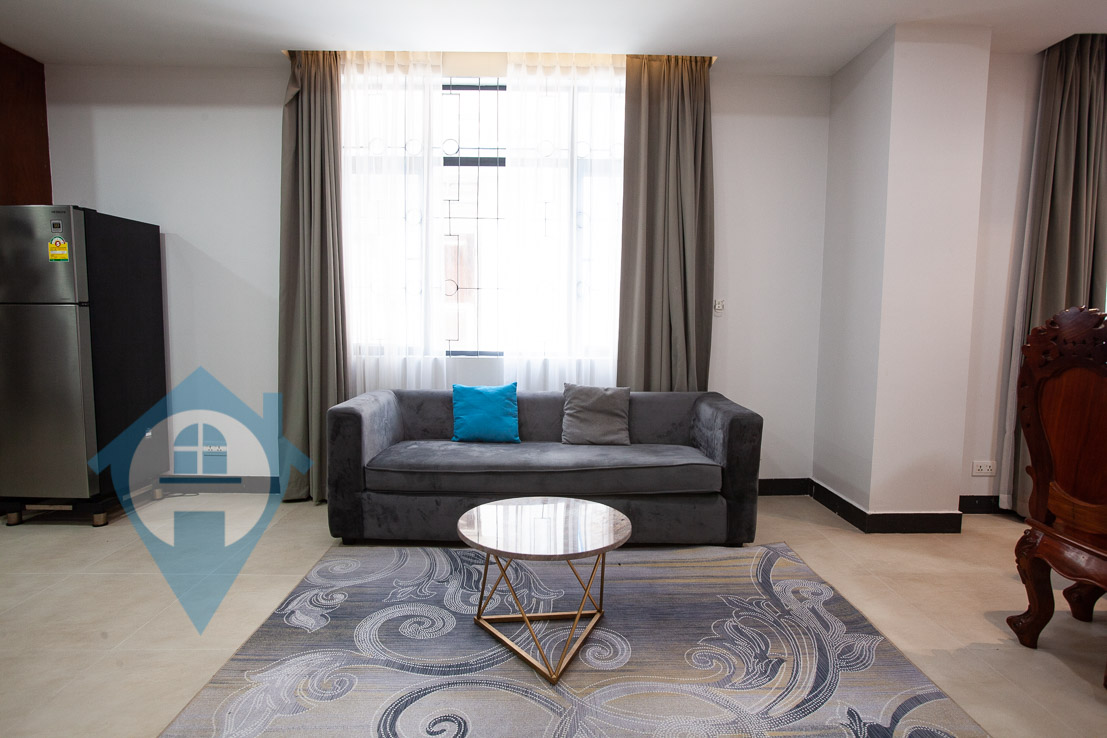 This spacious three bedroom apartment for rent is located within walking distance of the landmark Aeon mall in Tonle Bassac central Phnom Penh. The apartment comes fully furnished and serviced with three bedroom and three bathroom. There is a small balcony off the living area. The building benefits from secure parking, gym, 24 hour security and a rooftop sitting area. Please quote property code : PRE001530