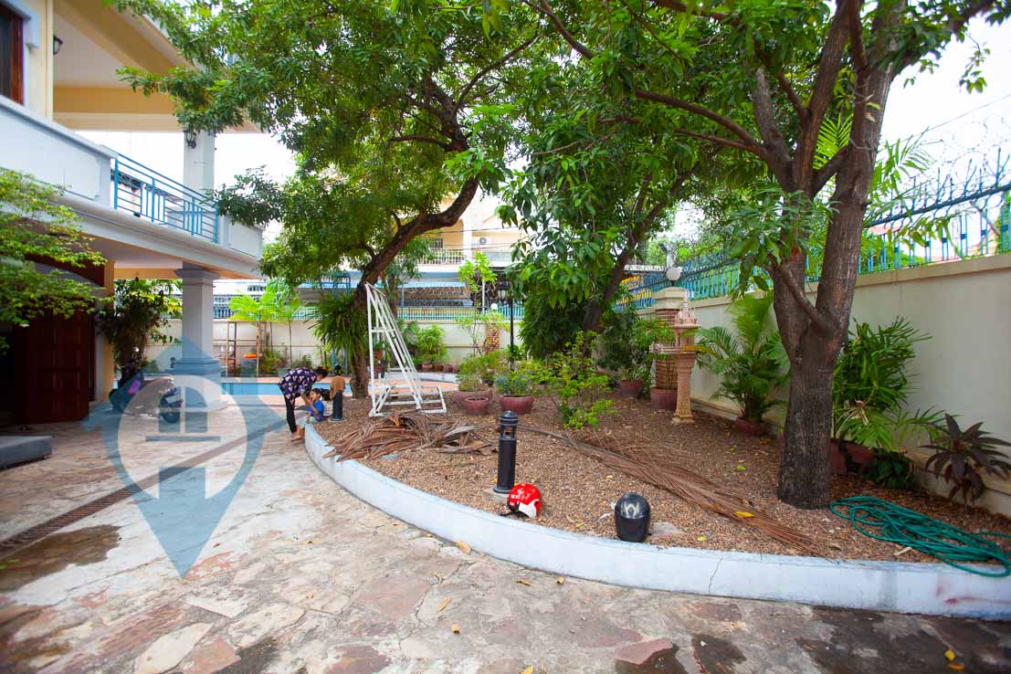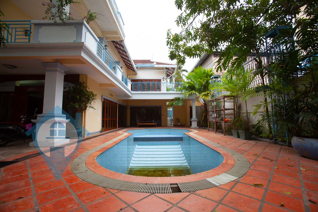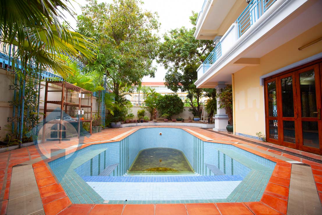 This spacious six bedroom villa for sale is located in the central district of Tonle Bassac in Phnom Penh. The villa comes with six large bedrooms and five bathrooms plus several large living and dining areas. The property comes with a large fitted kitchen plus a smaller staff kitchen. The villa has a large private swimming area surrounded my a mixture of terraces and a mature garden. The site is 21m X 30m = 629 sqm with both covered and open parking for multiple cars. This villa is in a quiet residential area and comes with a hard title. Please quote property code : PRE001519
