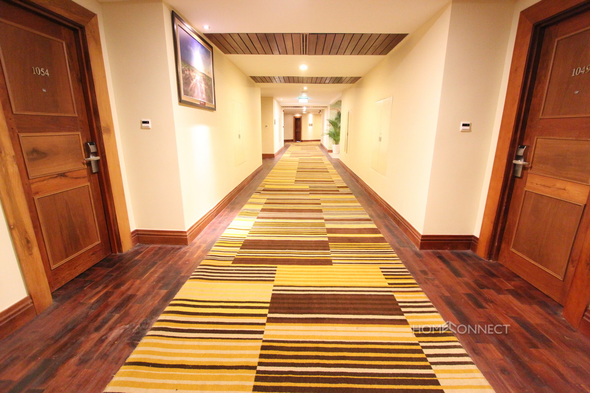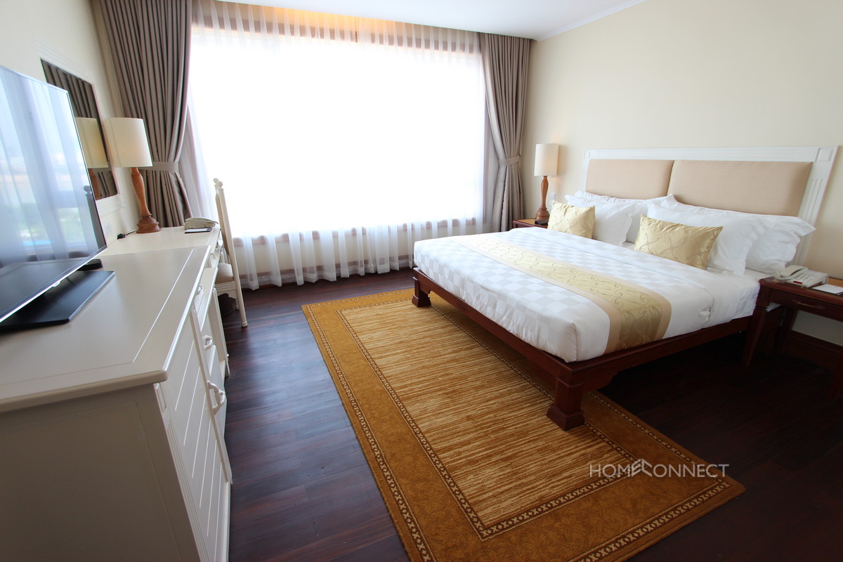 This apartment is located in a Large Hotel Complex to the east of central Phnom Penh, in the district of Chroy Chongva. The apartment comes fully serviced and furnished with no additional costs to the tenant. This apartment features a modern, fully equipped kitchen which adjoins a large lounge/living room. There are two bedrooms with a master that comes with a large, fully equipped en-suite. The apartment comes with all the modern convinces and furnishings expected from a 5 star Hotel. The tenant has full use of the many facilities of the hotel including the large pool, gymnasium and tennis courts. This rental price is for tenancy of 6 months or longer. Property Code : PC000389