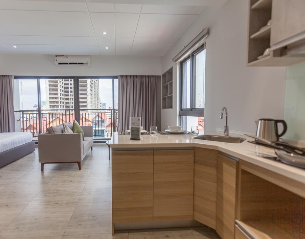 This studio apartment for rent is located in the central district of Boeung Trabek in Phnom Penh. The apartment comes fully furnished and fully serviced. The building benefits from secure parking, swimming pool, spa, gym, roof garden, coffee area and rooftop seating area. Please quote property code : PRE001852
