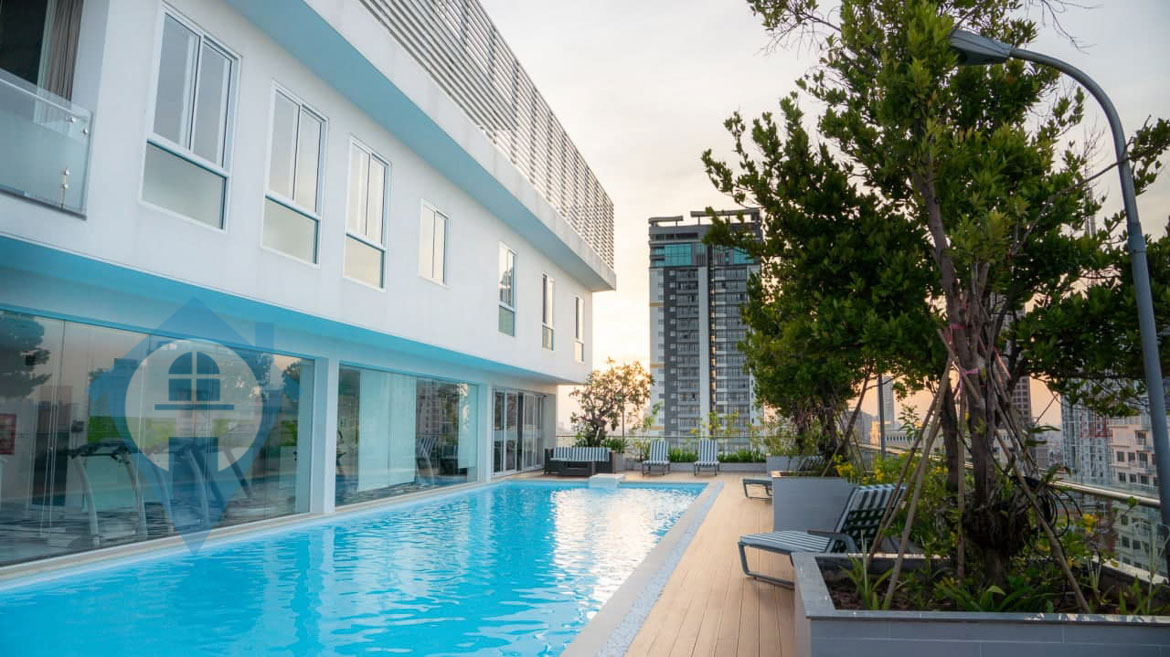 This modern serviced apartment in BKK1 is now available for rent. This two bedroom property has an en-suite bathroom, aircon throughout and built-in wardrobes. There is a modern kitchen and contemporary furnishing throughout this stylish property. The apartment comes with a secure car space and this building has security system integrated with lift access, swimming pool and gym. Property Code : PC000127