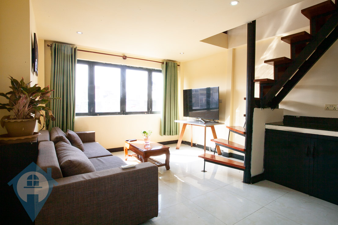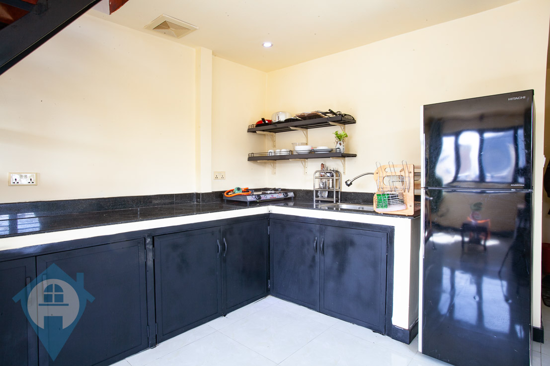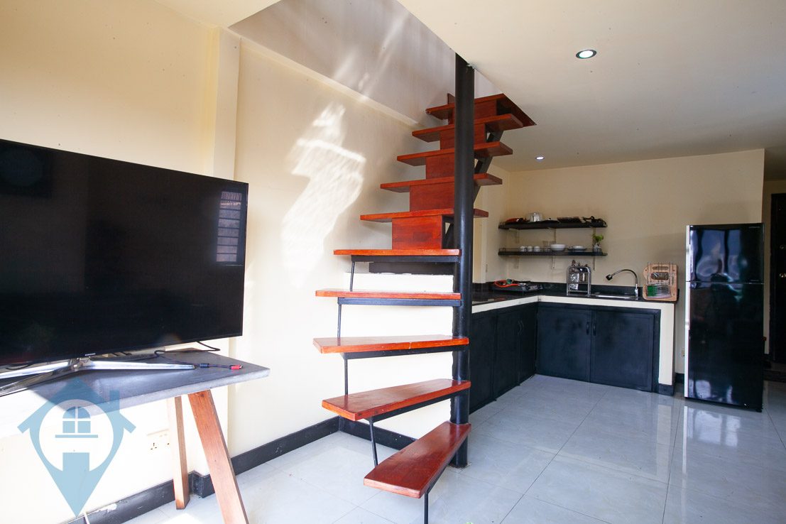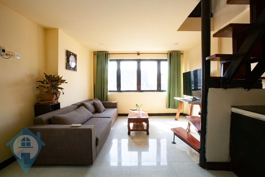 This western style one bedroom apartment for rent is located close to the landmark Royal Palace near riverside in Phnom Penh. The apartment comes with one bedroom and one bathroom. The property is a duplex with the kitchen and living area on the lower floor and the bedroom and balcony on the higher floor. The apartment comes full furnished and is both bright and airy. This apartment is on the 4th floor and there is communal parking for both cars and motos close by. A main benefit of this apartment is the close proximity to shops, cafes restaurants and is within easy walking distance of the popular riverside. Please quote property code : PRE001274